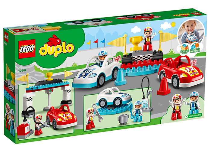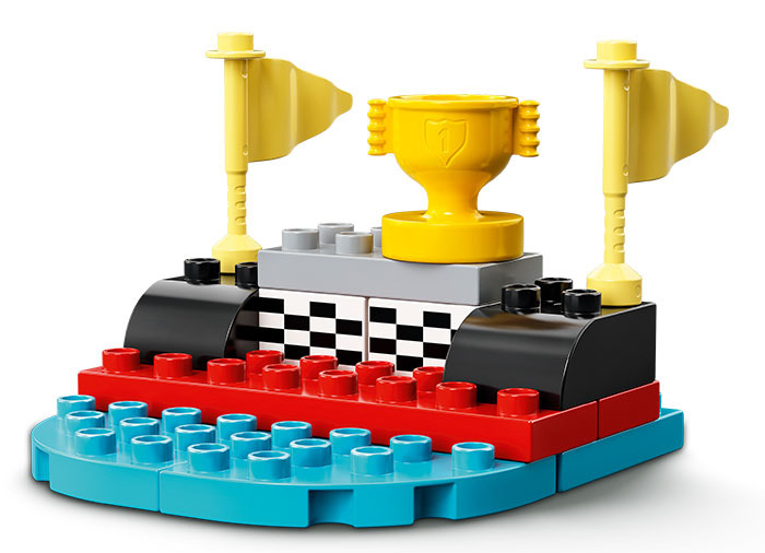 LEGO® DUPLO® Town (10947) Maşini de curse sunt un set de joc de curse colorat şi plin de distracţie cu joc pe roluri şi beneficii de dezvoltare pentru micii piloţi.