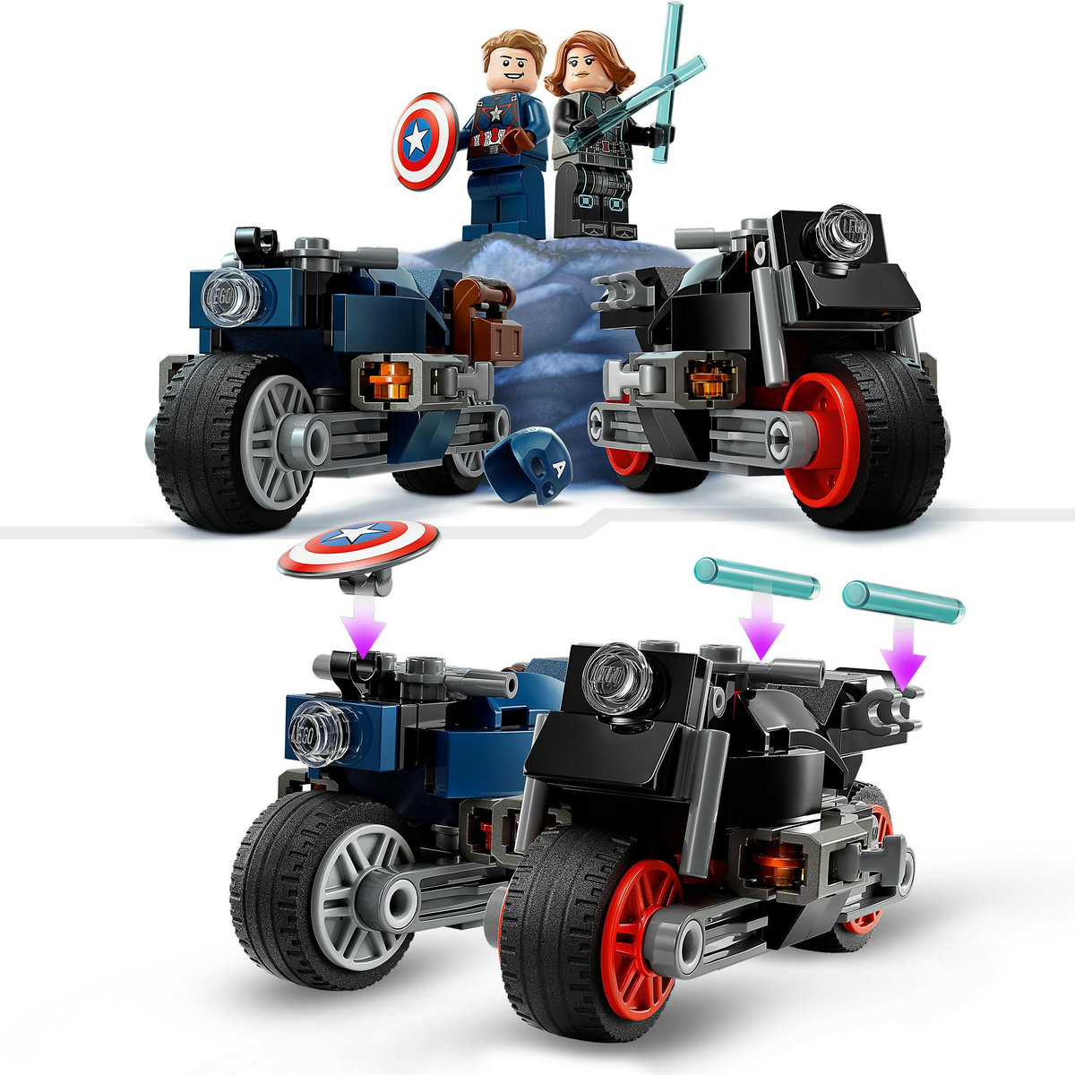 Minifigurinele Căpitanul America şi Black Widow călătoresc pe motocicletele văzute în premieră în memorabilul film Răzbunătorii: Sub semnul lui Ultron, creat de Marvel Studios în 2015. Ambele motociclete sunt dotate cu arme laterale şi suporturi pentru bastonul lui Black Widow şi scutul Căpitanului America. Minifigurinele sunt uşor de desprins de pe motociclete pentru a extinde şi mai mult posibilităţile de joacă. Pentru mai multă distracţie digitală, constructorii pot apropia şi roti seturile în 3D şi-şi pot monitoriza progresul cu ajutorul aplicaţiei interesante şi intuitive LEGO