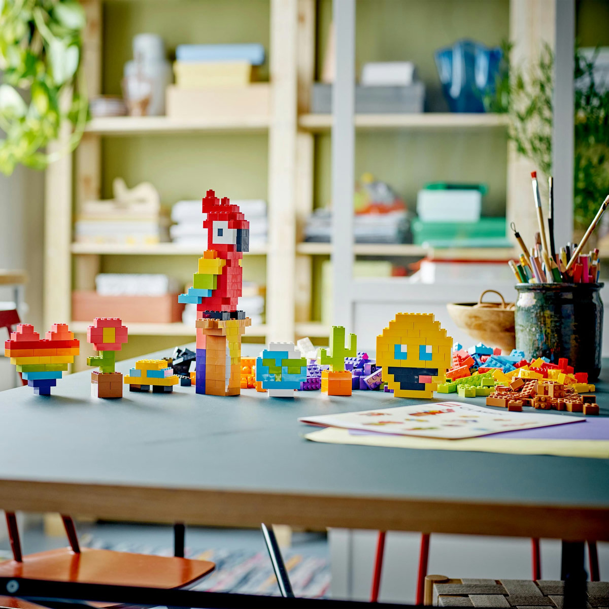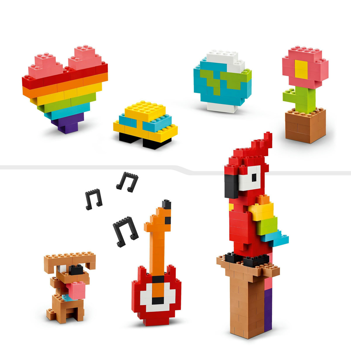 Setul conţine o cantitate mare de cărămizi LEGO viu colorate, în special foarte populara şi originala cărămidă 2x4! Setul include instrucţiuni tipărite, clare, pentru construcţia unor modele amuzante, între care o maşină, unglob, o floare, o inimă, o chitară, o casă, un emoji zâmbăreţ, un papagal, un câine şi un măr. Tot ce ţine de acest set încurajează joaca creativă liberă. Setul include chiar şi o revistă cu multe instrucţiuni de construcţie şi sugestii pentru micul tău designer. O versiune digitală a instrucţiunilor de construcţie din set poate fi găsită în aplicaţia LEGO Builder.