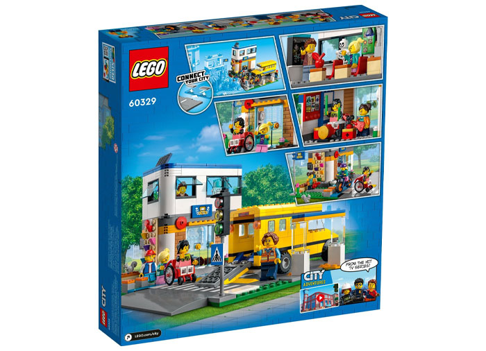 Ia autobuzul pentru o zi distractivă la şcoală cu Billy şi Maddy, personajele TV din LEGO® City. Ai grijă la copilul care goneşte cu BMX-ul pe pista de biciclete! Coboară rampa pentru scaunul cu rotile şi ajută elevul să iasă, apoi traversează trecerea de pietoni pentru a ajunge în curtea şcolii. Încearcă peretele de escaladă sau un joc de şotron înainte de lecţia de artă creativă, unde poţi exersa câteva ritmuri la tobe. şcoala asta e super cool!