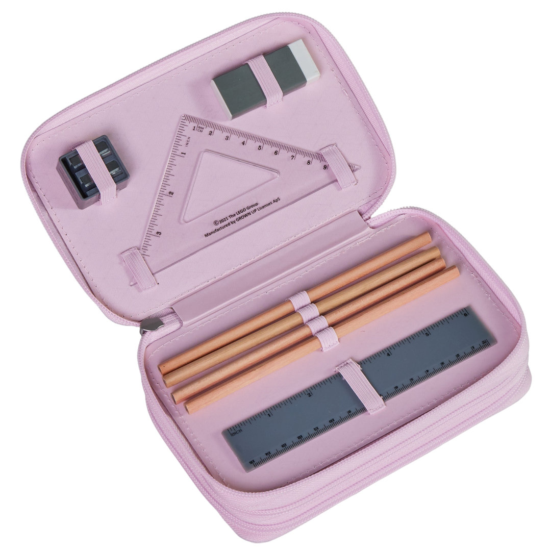 Penarul conţine: 4 creioane, 2 creioane groase, 18 creioane colorate, 4 creioane colorate groase, radieră, ascuitoare, riglă ţi triunghi.