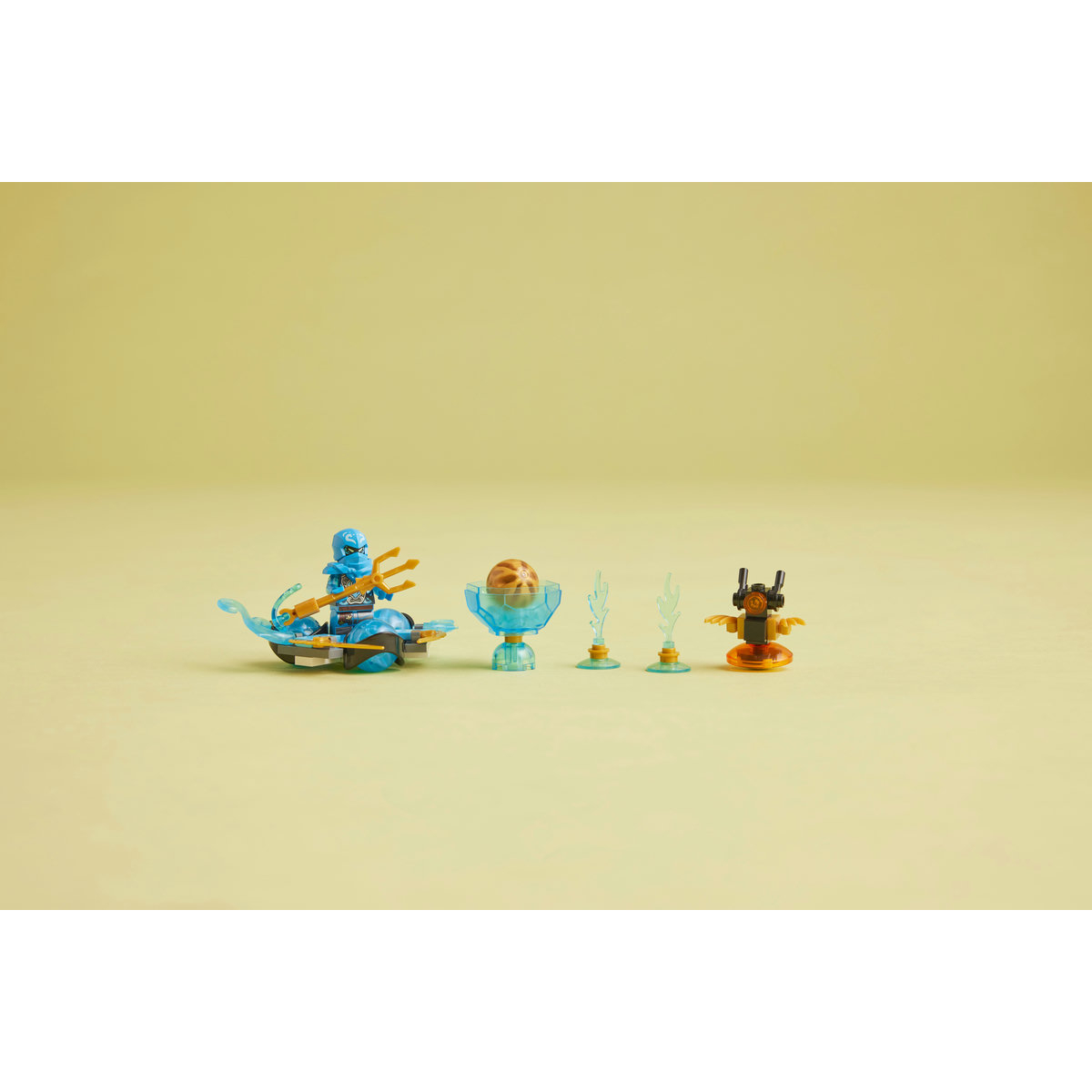 Copiii o aşază pe Nya cu puterea dragonului în spinnerul împodobit cu 3 elemente exclusive putere de dragon, împing spinnerul înainte şi o urmăresc pe Nya executând drifturi. Sarcina ei e să evite obstacolele cu apă, să-l învingă pe droidul imperial cu toiag în mână şi să obţină elementul auriu de colecţie nucleu de energie a dragonului din bolul în care se află. Există şi un element putere de dragon albastru, iar copiii pot colecţiona alte 4 astfel de elemente în diferite culori, din alte seturi NINJAGO®.