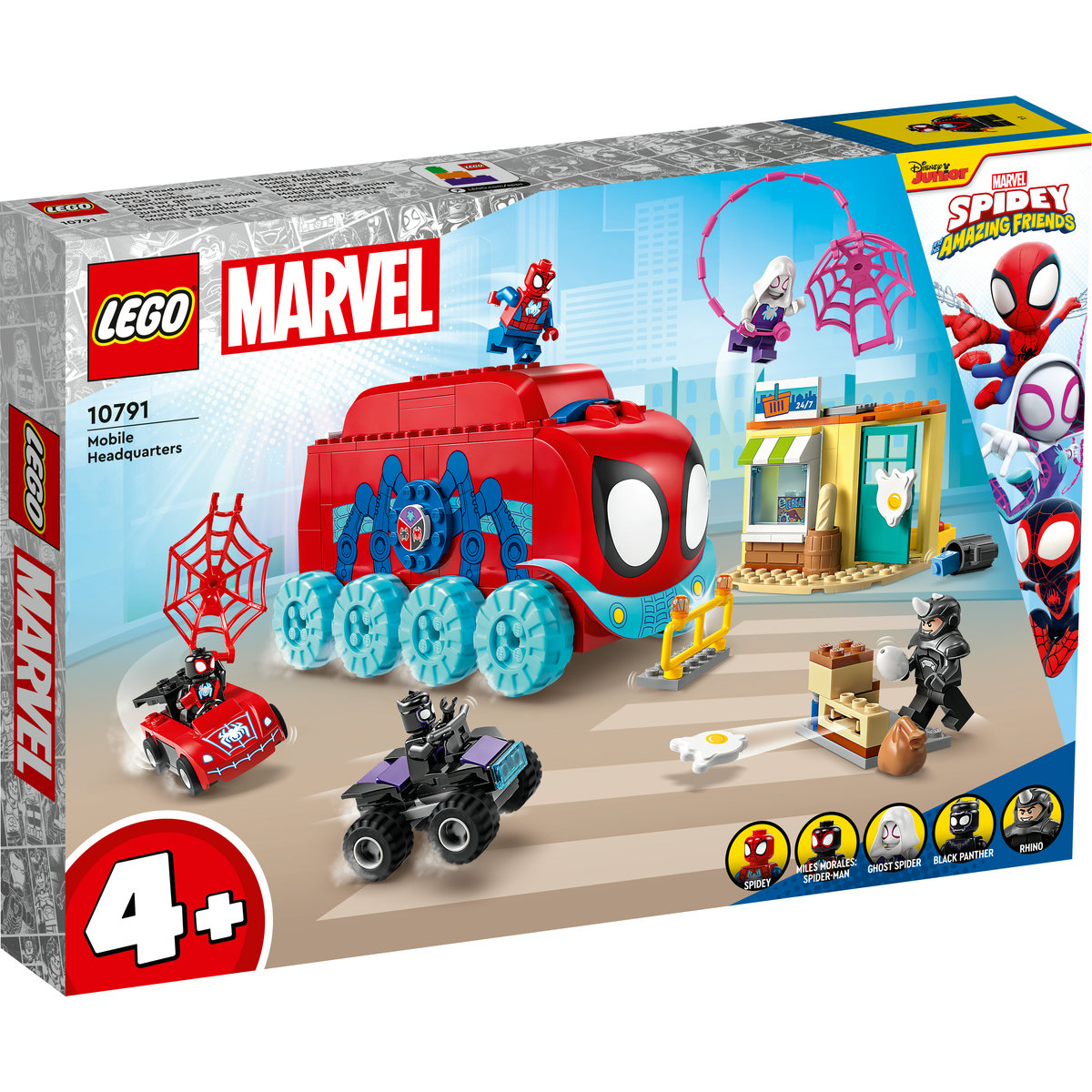 Setul include 5 minifigurine +u2013 Spidey, Păianjenul-Fantomă, Miles Morales, Pantera neagră şi Rinocer +u2013 precum şi un sediu construibil pentru Spidey şi echipă. Sediul mobil are un cockpit cu deschidere şi o uşă în spate, prin care o maşină decapotabilă şi un ATV pot intra şi ieşi. Rinocerul e echipat cu un lansator de ouă. Ţinta lui e o băcănie, care conţine muniţie din belşug pentru o luptă cu alimente. Accesoriile includ pânză de păianjen şi piese de mobilier stradal, iar un şasiu din 2 cărămizi şi un ghid-poveste ilustrat oferă copiilor încrederea de a asambla setul. Pentru mai multă distracţie digitală, aplicaţia LEGO Builder conţine instrumente de apropiere şi rotire, care permit copiilor să-şi vizualizeze modelul în timp ce-l construiesc.