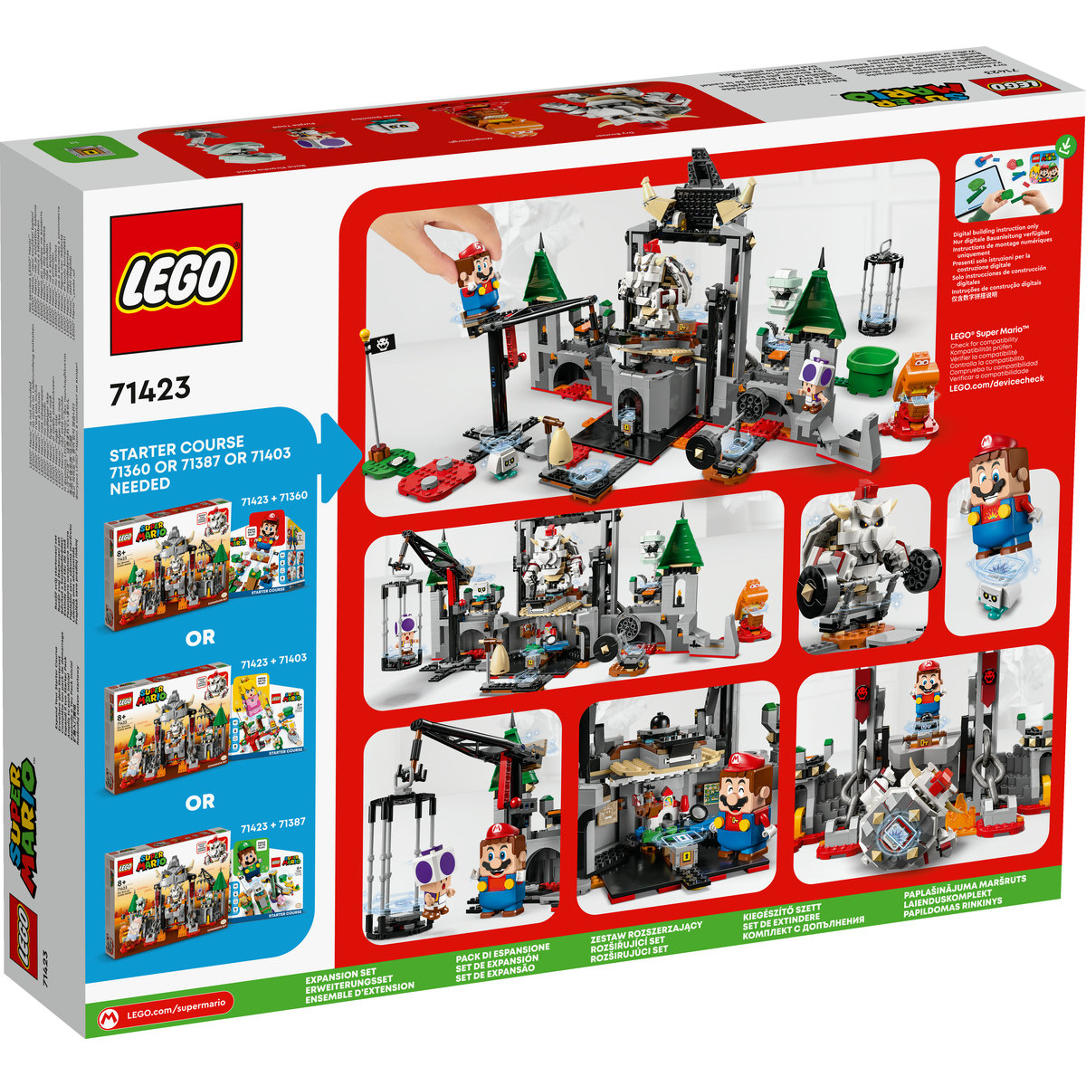 Creează o versiune fantastică din cărămizi LEGO® a unei locaţii emblematice din universul Super Mario™ cu Setul de extindere Bătălia lui Dry Bowser de la castel (71423). Jucătorii pot explora castelul cu figurina lor interactivă LEGO® Peach™, LEGO® Mario™ sau LEGO® Luigi™ (nu e inclusă). Acesta are o poartă cu deschidere în formă de fălci de Bowser, o macara ca să-l salvezi pe Toad mov din capcană ţi ca să-l răstorni pe Dry Bowser, flippere ca să învingi Planta piranha schelet ţi pe Bone Goomba, o funcţie de atac pentru Magmaargh, sală de antrenament, o intrare secretă, o cameră secretă de strategie, un Bloc cheie ţi un Bloc cufăr cu comori. Notă: setul de bază 71360, 71387 sau 71403 e necesar pentru joaca interactivă.