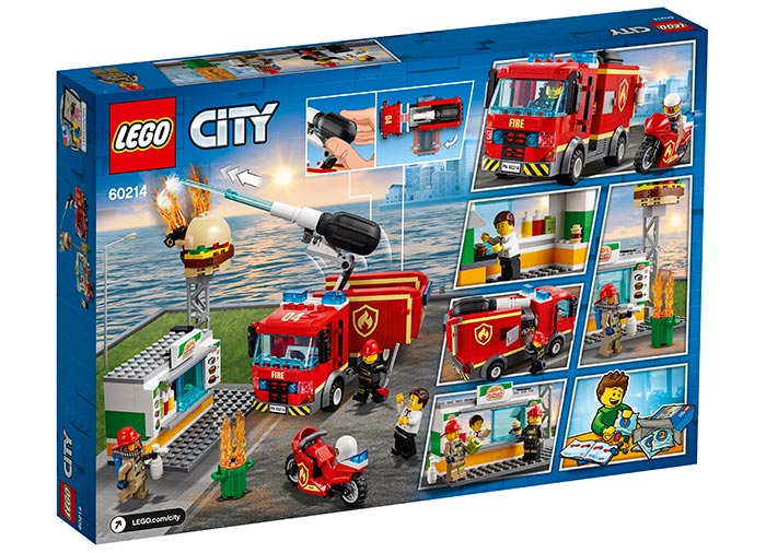Apara toneta de burgeri cu fantasticul set 60214 Incendiu la Standul de Burgeri, care include un stand de burgeri cu emblema ?i piese de flacari care pot fi rasturnate, geam glisant ?i co? de gunoi. Acest set distractiv include ?i un camion de pompieri cu cabina, 2 spa?ii de depozitare, spate rotativ ?i noua pompa direc?ionala pentru stins incendiile. Setul mai include o motocicleta cu spa?iu pentru un stingator de incendii, un topor nou pentru ianuarie 2019 ?i 3 minifigurine.