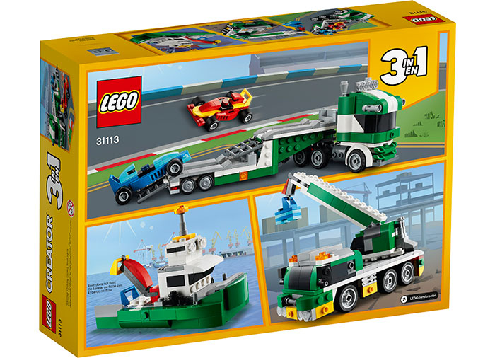 Pe micii constructori ii asteapta aventuri palpitante in curse cu jucaria minunata de constructie Transportor de masini de curse LEGO Creator 3 in 1 (31113). Aceasta consta dintr-un camion cu remorca detasabila ce transporta 2 masini rapide care pot fi descarcate pe o rampa, permitand copiilor sa se bucure de actiune de curse. Jucarii distractive pentru joaca imaginativa Exista 3 modele impresionante diferite pentru constructie si joaca in acest set de constructie LEGO Creator 3 in 1. Copiii pot crea un camion cu remorca si 2 masini de curse, iar apoi il pot reconstrui intr-o automacara de jucarie sau intr-un mini remorcher. Sau pot folosi cele 328 de caramizi si piese pentru a construi ceva cu totul nou. Cele mai bune jucarii pentru constructie creativa Jucariile de constructie LEGO Creator 3 in 1 deschid o lume de posibilitati nesfarsite cu 3 modele diferite de creat in fiecare cutie! Constructorii LEGO vor fi entuziasmati de toate optiunile captivante ce li se ofera. Creator 3 in 1 inspira imaginatia copiilor si ii amuza ore in sir cu o selectie minunata de seturi, incluzand creaturi infricosatoare, avioane rapide si cladiri detaliate.