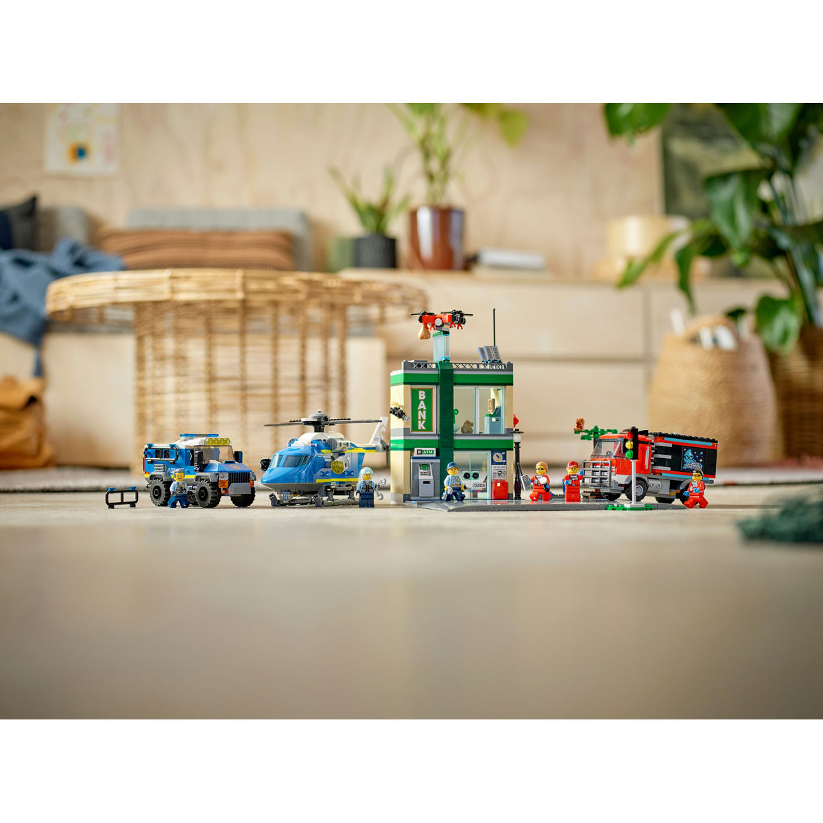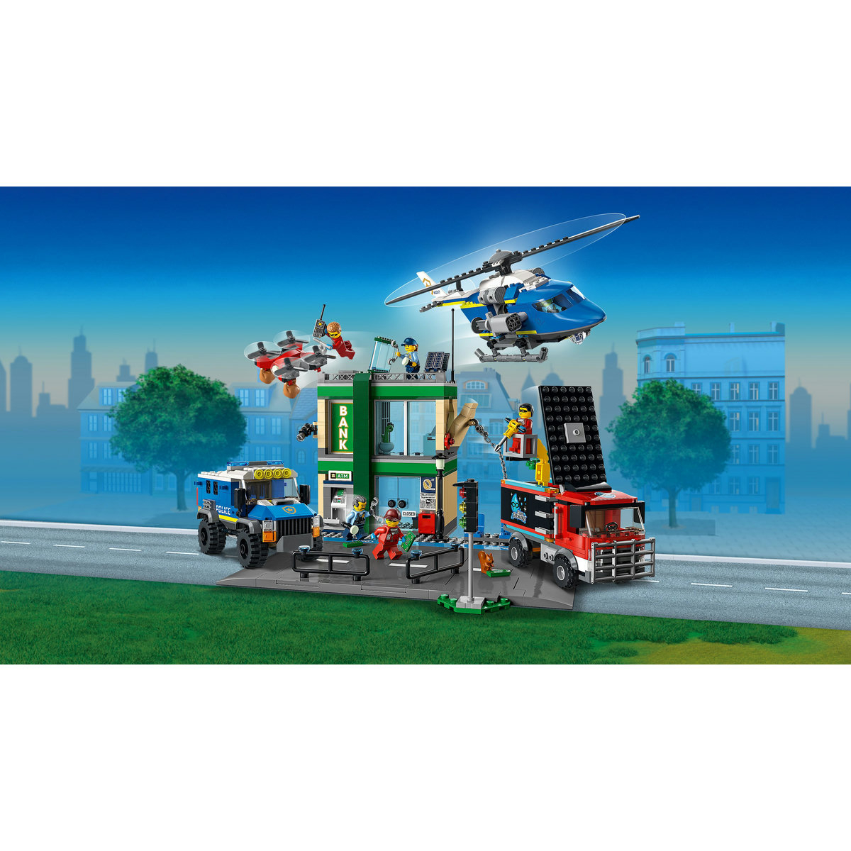 Betty, Hacksaw Hank şi Vito comit un jaf la banca din oraş. Trosc! Ei fac nişte găuri uriaşe în ziduri pentru a scoate aurul, bancomatul şi numărătorul de bancnote. E un jaf hi-tech - au chiar şi o dronă! E timpul să trimiţi forţele speciale LEGO® City. Mobilizează elicopterul cu lansator de plasă, urcă-te în camionul blindat super puternic şi ajută-i pe Rooky Partnur şi pe Sam Grizzled să salveze situaţia!