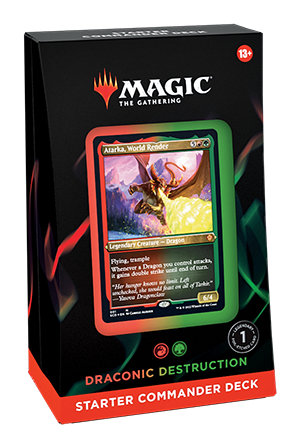 Cele 5 Commander Decks incluse in Evergreen Starter Commander sunt: First Flight (White-Blue), Grave Danger (Blue-Black), Chaos Incarnate (Black-Red), Draconic Destruction (Red-Green) si Token Triumph (Green-White). Fiecare vine cu cutia sa, 1 carte Legendary in folie + 99 de carti normale, 10x token-uri cu doua fete, punchout counters, strategy insert, si carte de referinta.