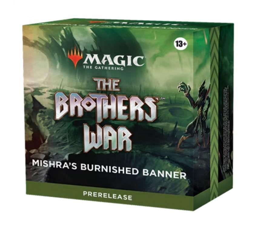 Magic: The Gathering - The Brothers War Prerelease Pack este disponibil in variantele Urza's Iron Alliance si Mishra's Burnished Banner care contin 6x The Brothers’ War Draft Boosters, 1 carte cu folie Rare sau Mythic Rare, 1 carte cu cod MTG Arena (disponibile numai in anumite zone), 1 deck box si 1 Spindown life counter.