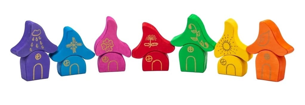 Casutele piticilor, joc handmade Sau Căsuțe elfilor sau altfel de cuburi Piesele pot fi stivuite pentru a forma căsuțe colorate sau pot fi folosite ca un joc de echilibru. Culorile curcubeului vor înveseli joaca. Conține 7 căsuțe, fiecare din 2 piese de forme, culori și dimensiuni diferite, decorate manual. Vârsta recomandată: +3 ani. Confecționat din materiale și vopsele non toxice conform reglementărilor EN71&ASTM. AVERTISMENT: Contraindicat copiilor sub 3 ani. Conține părți mici. Se recomandă supravegherea copilului de către un adult în timpul jocului. Producător: Marc toys, Moldova