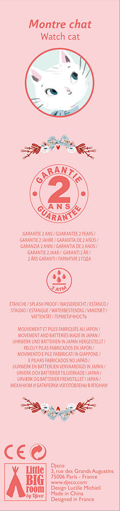 Ceas de mână Pisica Un ceas elegant cu cuarț frumos ilustrat cu o pisică pentru a învăța să citească ora. Un ceas educativ cu două cadrane distincte (unul pentru ore, celălalt pentru minute) și mâini fine pentru a facilita citirea orei. Datorită mișcării japoneze Miyota 2035, mecanismul este silențios. Un ceas cu o carcasă rezistentă la șocuri și rezistență la apă până la 3 bar. Funcționează cu o baterie SR626SW (inclusă). Rezistent la apă până la 3 ATM. Mecanism și baterie fabricate în Japonia. 2 ani garanție. Ceasul vine ambalat într-o cutie decorativă. Funcționează cu baterie, care este inclusă în set. Vârsta recomandată: +3 ani. AVERTISMENT: Contraindicat copiilor sub 3 ani. Conține piese ce pot fi înghițite. A se utiliza sub directa supraveghere a unei persoane adulte. Producător: Djeco, Franța.