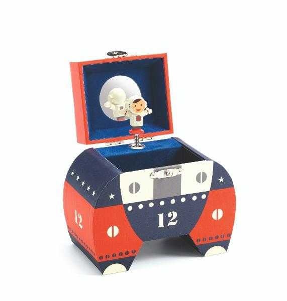 Cutie muzicala Racheta Polo 12 este o cutie muzicală în formă de rachetă frumos decorată. Rotiți cheița, deschideți cutia și... surprizăi! O figurină astronaut se rotește, reflectat într-o oglindă. Melodia „Take Me Out to the Ball Game” de Albert Von Tilzer durează aproximativ 2 minute și 30 de secunde. Conținut: o cutie muzicală din lemn acoperită cu hârtie, căptușită cu catifea. Dimensiune cutie muzicală: 14,5x17,5x7,8 cm. Latime pachet: 15 cm Inaltime pachet: 9 cm Adancime pachet: 18,5 cm Vârsta recomandată +3 ani. Confecționată din carton și metal și textil. Certificare FSC®. AVERTISMENT: Acest articol nu este jucărie. A nu se lăsa la îndemâna copiilor sub 3 ani. Design: Gervaise Producător: Djeco, Franța.