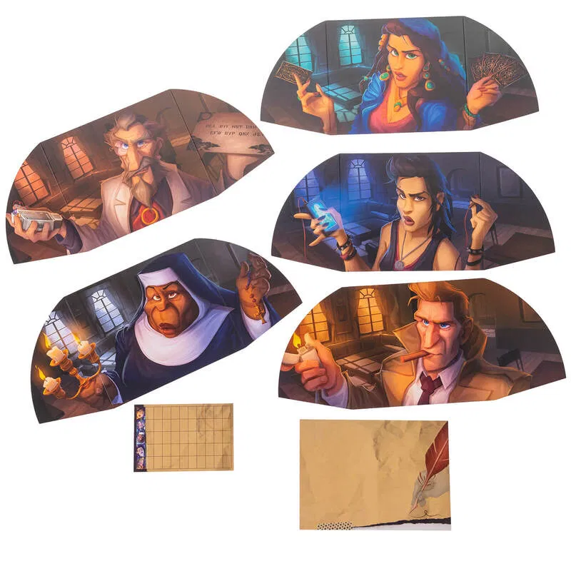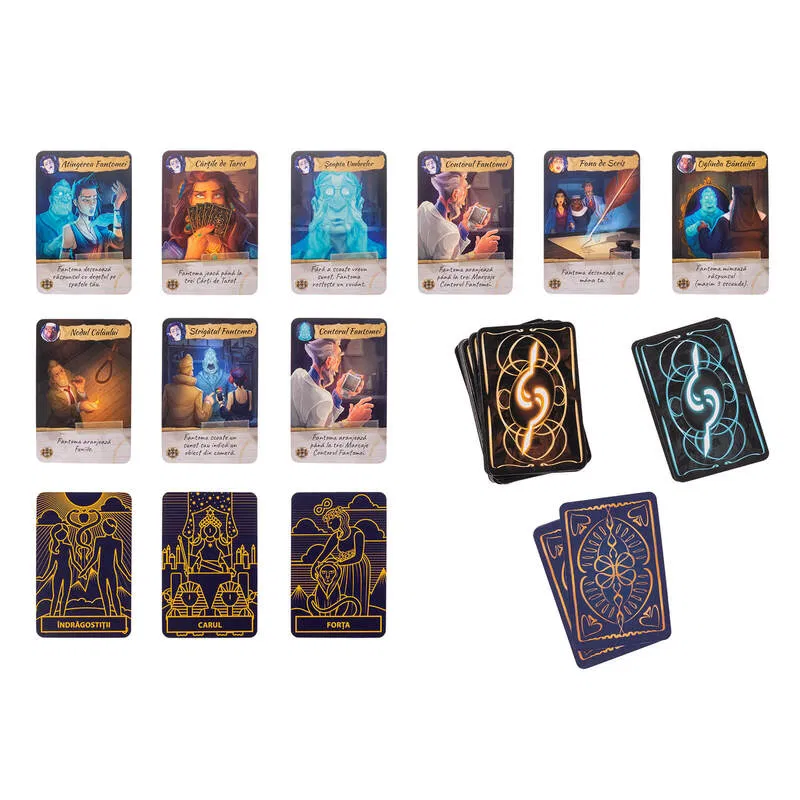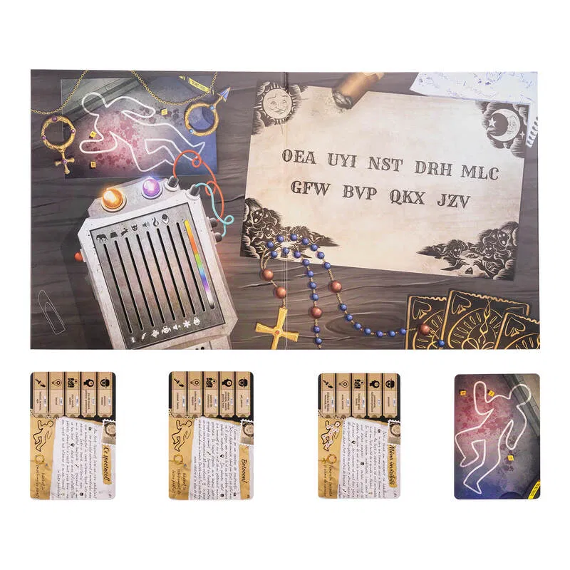 • Componente variate: 35 cartonase de interactiune, panouri pentru detectivi, fise de investigatie, Tarot, markere, jetoane si tabla de joc