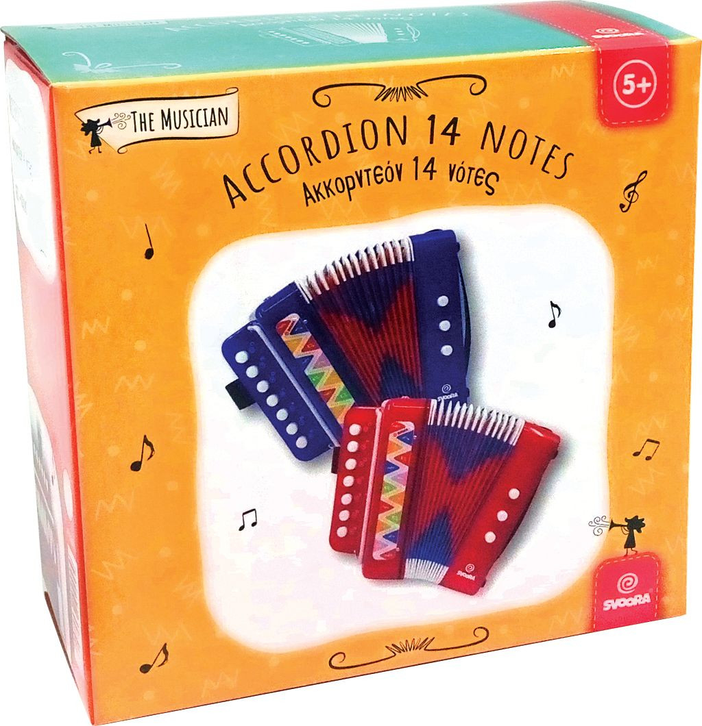 Instrument muzical de jucărie, cu sunet plăcut și armonios, identic cu cel real. Creat pentru explorări muzicale, acordeonul cu 14 note vă va inspira să compuneți primele melodii. Are mâner cu curea pentru o prindere mai bună. Dimensiune: 19 X 10 X 18 cm. Vârsta recomandată: + 5 ani. AVERTISMENT! Contraindicat copiilor sub 3 ani. A se folosi sub directa supraveghere a unei persoane adulte. Producător: Svoora, Grecia