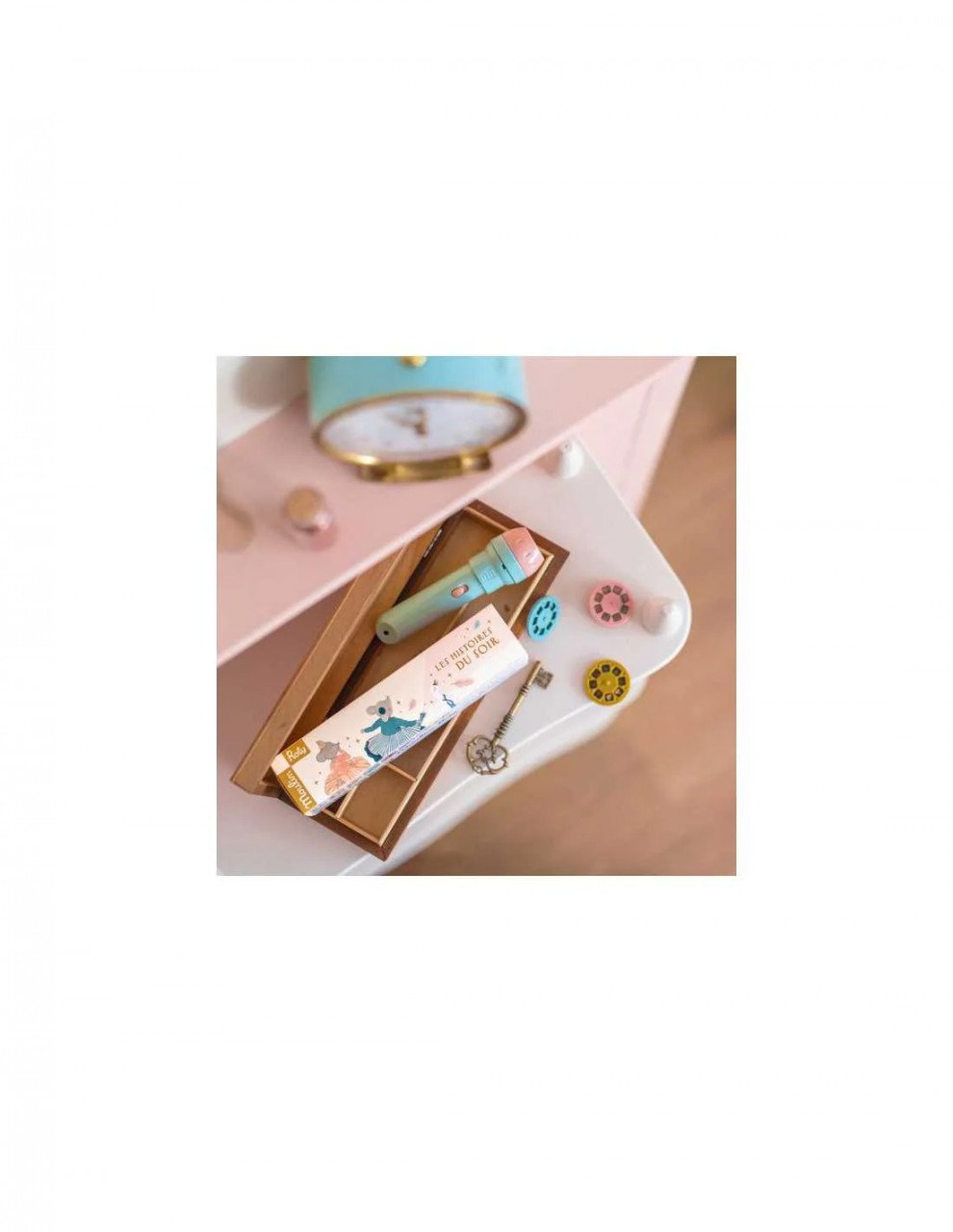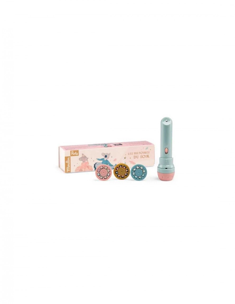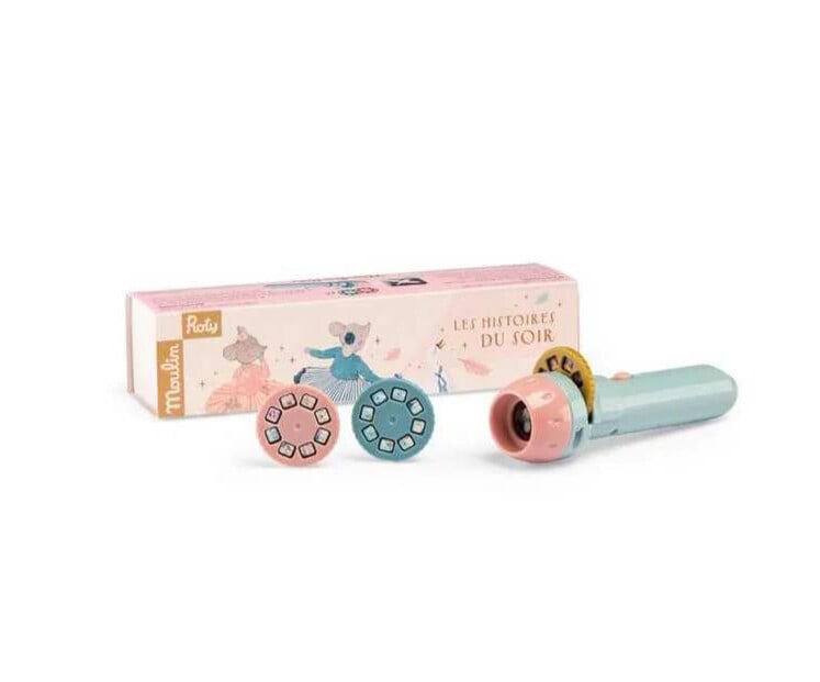 Lanterna cu povești Mica scoala de dans 3 discuri proiectate pe perete spun o poveste colorată, fără cuvinte, despre personajele din colecția Mica scoala de dans (La petite école de danse). Un moment magic pentru întreaga familie. Introduceți discul ales în fanta lămpii, apasați butonul de pornire, focalizați și proiectați imaginea pe perete sau tavan, apoi rotiți discul pentru a proiecta următoarele imagini. Lampa proiectează imagini pe o distanță de până la 90 cm. Funcționează cu 3 baterii incluse (1,5 V AG13/LR44). Vârsta recomandată: 4 - 7 ani. Material: plastic ABS. Se curăță cu o cârpă moale și umedă. Producător Moulin Roty, Franța.