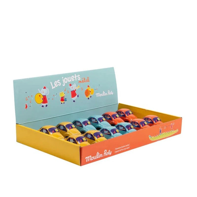 Masinuta metalica galbena Mașinuță colorată, ilustrată cu animale muzicieni veseli. Trage mașina înapoi pentru a o încărca și vezi cât de repede va alerga! Copilul se poate juca singur sau cu prietenii, iar acest joc le dezvoltă abilitățile motorii, fiind în același timp foarte distractiv! Dimensiuni: 8.5 x 4.5 x 4 cm Vârsta recomandată: + 3 ani. Confecţionate din metal (staniu). Conform reglementarilor EN71&ASTM. AVERTISMENT! Contraindicat copiilor sub 3 ani, conţine piese mici, pericol de înghițire. A se folosi sub directa supraveghere a unei persoane adulte. Citiţi cu atenţie eticheta înainte de a înmâna jucăria copilului. Producător: Moulin Roty, Franța.