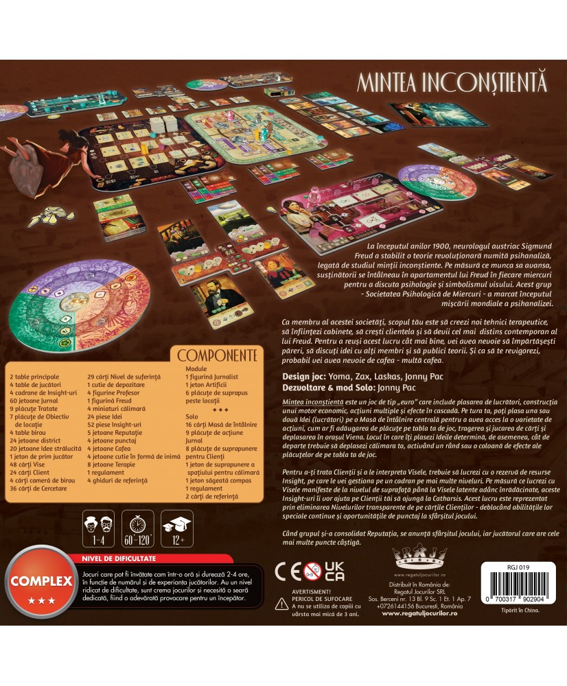Patrunde in fascinantul univers al psihanalizei alaturi de Sigmund Freud si exploreaza profunzimile subconstientului in Mintea Inconstienta, un joc euro complex si elegant, plasat in Viena inceputului de secol XX. Ca membru al faimoasei „Wednesday Psychological Society”, vei descifra vise, vei formula teorii si vei trata clienti, urmarind sa devii cel mai renumit discipol al lui Freud.
