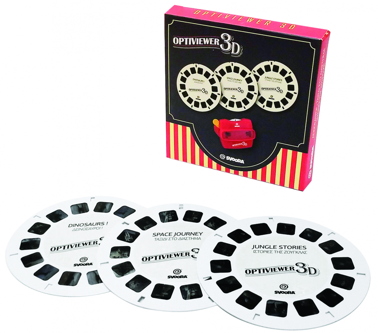 3 ROLE OPTIVIEWER 3D Haideți să explorăm noi povești uimitoare 3D! Set cu 3 role: Dinozauri, Poveste din junglă și Călătorie în spațiu.Imagini 3D impresionante vin să extindă distracția 3D Optiviewer! Descrierea conținutului imaginilor poate da startul multor povești diferite care sporesc imaginația, dezvoltă observația, lărgesc creativitatea și ajută copilul să rămână concentrat pe un anumit subiect! Toate imaginile care pot fi explorate de părinți și copii simultan, sporind legătura dintre ei! Compatibile cu 3D Optiviewer (#03005) și cu proiectoare similare. Introduceți discul, apoi apăsați maneta. În interiorul acestui dispozitiv de epocă, descoperiți o lume magică 3D. Imaginile sunt clare, fiind compuse din fotografii suprapuse care redau real imaginile. Vârsta recomandată: +3 ani. Confecţionată din carton și nylon. Conform reglementarilor EN71&ASTM. AVERTISMENT! A se folosi sub directa supraveghere a unei persoane adulte. Citiţi cu atenţie eticheta înainte de a înmâna jucăria copilului. Producător: Svoora, Grecia.