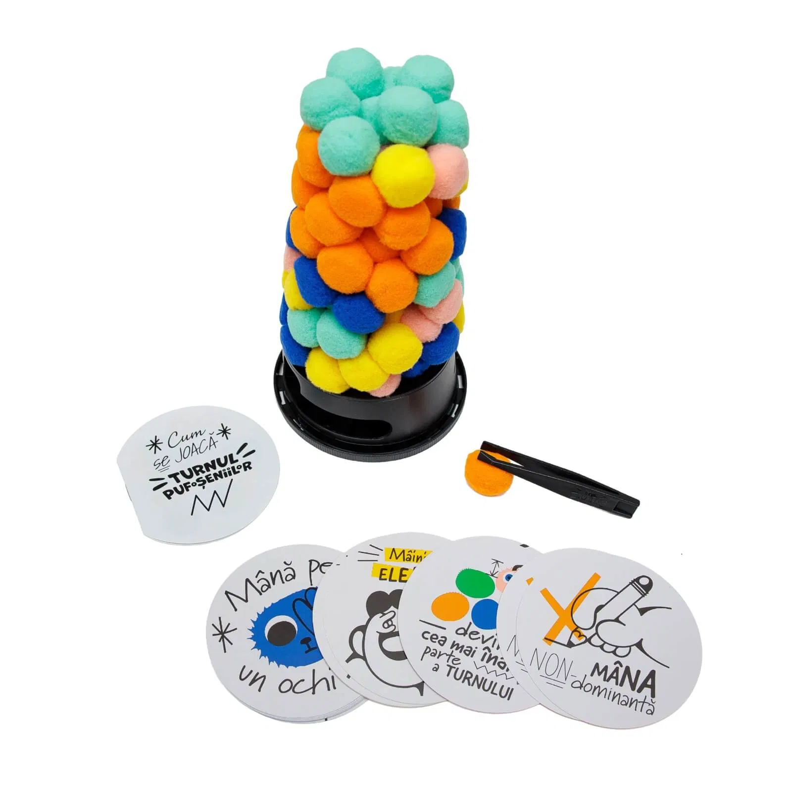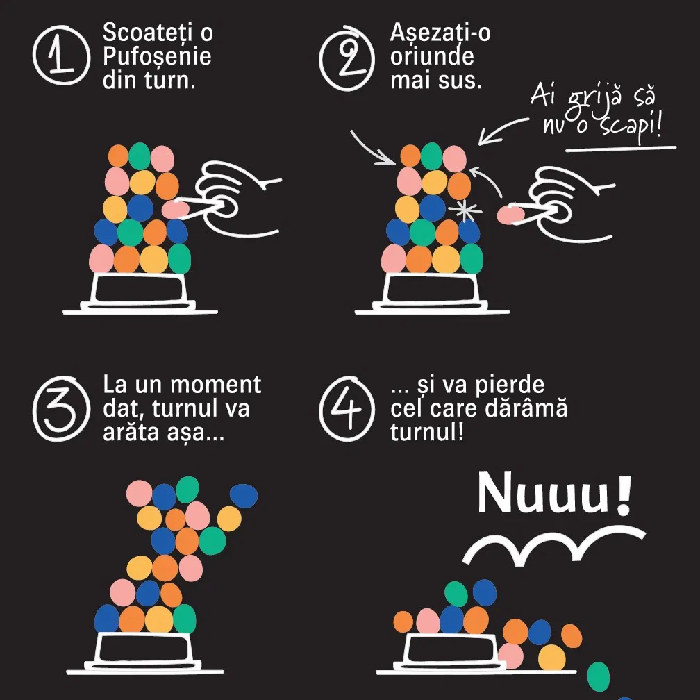 Turnul Pufoseniilor (RO) este un joc de familie colorat, vesel si plin de suspans, in care indemanarea fiecarui jucator este pusa la grea incercare! Construieste, muta si echilibreaza piese pufoase in timp ce eviti prabusirea turnului si treci prin provocari amuzante. Jocul este in limba romana si este perfect pentru seri distractive alaturi de copii sau prieteni.
