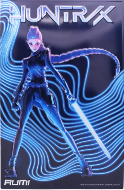 Este ideala pentru camere tematice, spatii dedicate colectiilor pop culture sau ca element decorativ statement pentru fanii K-pop, anime-inspired visuals si universuri fantasy. Finisajul metalic ii ofera un aspect premium, iar ilustratia clara pune in valoare atit personajul Rumi, cit si identitatea trupei Huntrix.