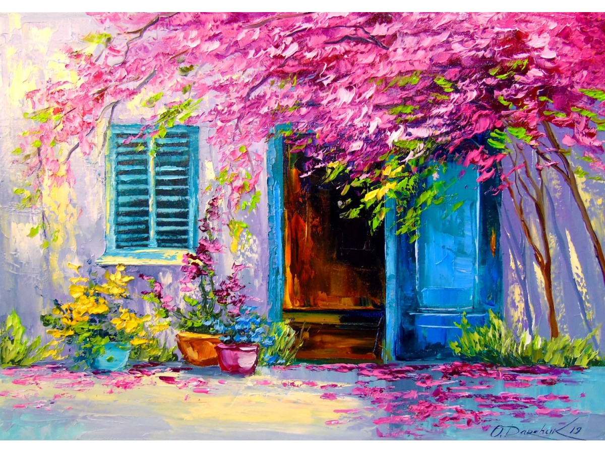 Puzzle-ul Blooming Courtyard de la Enjoy te invită într-un colț de paradis mediteranean, unde florile, lumina și arhitectura se împletesc într-o armonie vizuală perfectă. Imaginea redă o curte înflorită plină de culoare și viață, cu o poartă elegantă din fier forjat, o alee pietruită și ghivece pline de flori în nuanțe de roz, roșu, galben și violet. În fundal, o casă rustică cu obloane albastre completează atmosfera caldă și relaxată a unei după-amieze de vară.