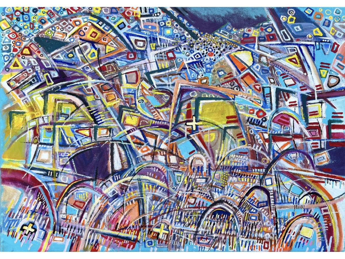 Culorile alternează între tonuri reci de albastru și gri și accente calde de portocaliu, roșu și galben, creând o tensiune vizuală ce reflectă perfect titlul lucrării. Fiecare detaliu transmite o senzație de mișcare controlată, ca într-o orchestră de linii și volume ce se împletesc într-un dans al simetriei și contrastelor.