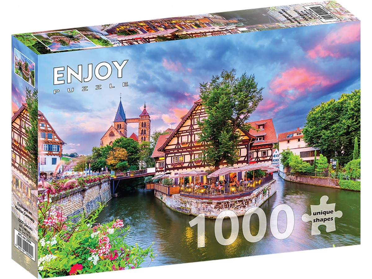 Puzzle 1000 piese Enjoy – Esslingen am Neckar, Germany surprinde farmecul orașului german Esslingen am Neckar, cu un râu serpuit care traversează centrul scenei. Malurile sunt marginite de clădiri istorice cu arhitectură tradițională germană, inclusiv case cu structuri de lemn la vedere și acoperișuri înalte. O terasă animată pe malul râului adaugă viață imaginii, în timp ce în fundal o biserică impunătoare cu turlă înaltă completează panorama. Cerul la apus, în nuanțe vibrante de roz și albastru, conferă scenei un efect magic și cald.