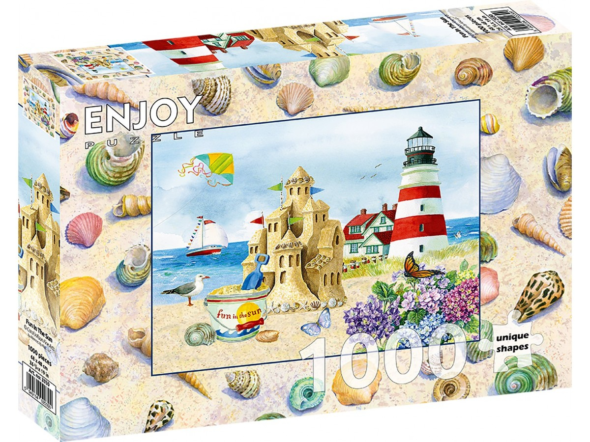 Puzzle-ul Fun In The Sun de la Enjoy ilustreaza o scena de litoral luminoasa si relaxanta, construita in jurul unui castel de nisip amplasat in prim-plan. Compozitia include elemente specifice unei zile insorite la mare, precum scoici, flori decorative, nisip fin si obiecte maritime care creeaza un cadru coerent si usor de parcurs vizual. In plan secundar apar cladiri de coasta si un far, iar in fundal se distinge marea calma, completand atmosfera de vacanta.