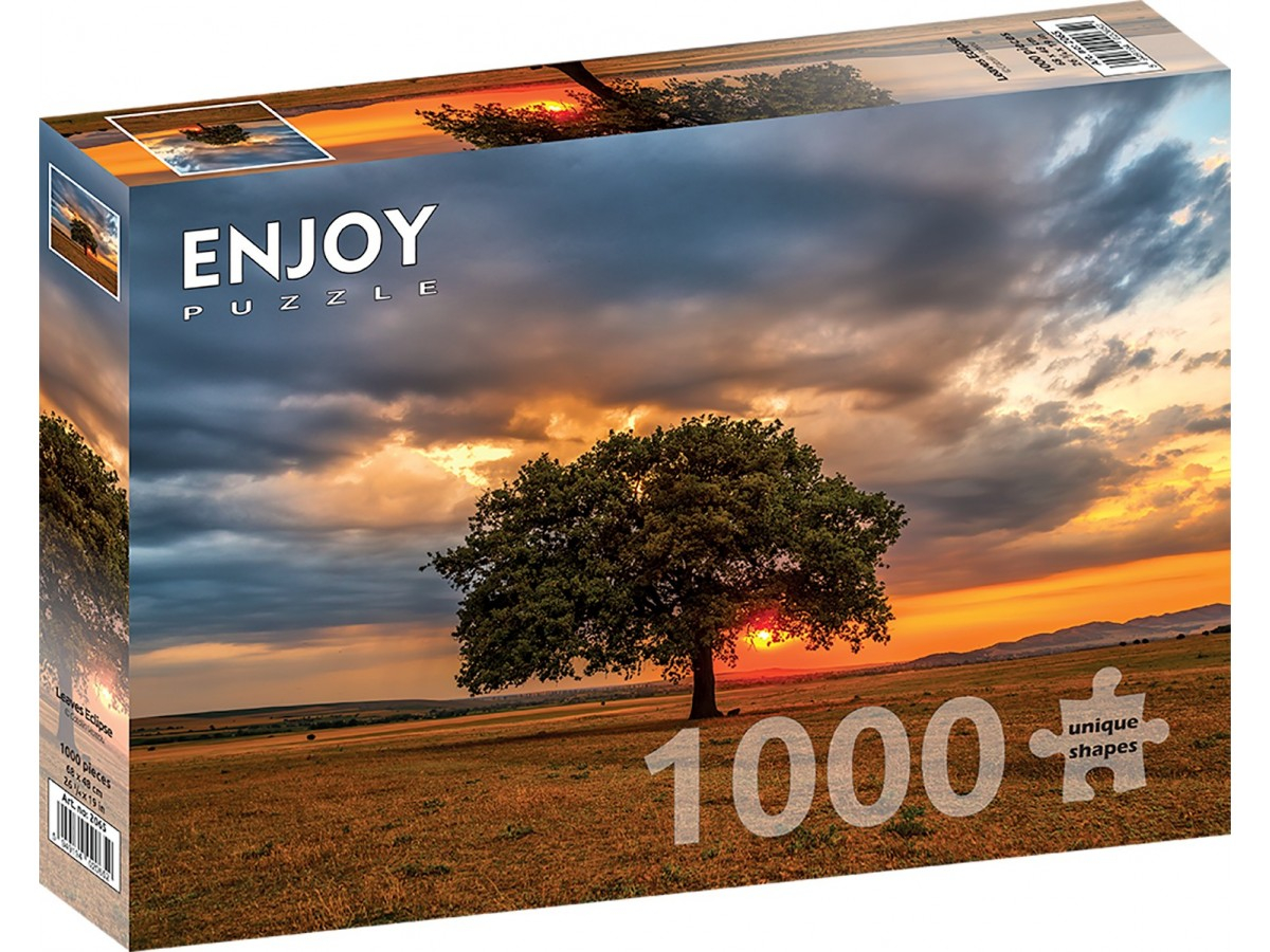 Puzzle 1000 piese Enjoy – Leaves Eclipse surprinde un moment spectaculos din natura, in care lumina apusului transforma un peisaj simplu intr-o scena plina de emotie si profunzime. In centrul compozitiei se afla un copac masiv, probabil un stejar, ale carui ramuri se decupeaza dramatic pe fundalul unui cer incandescent.