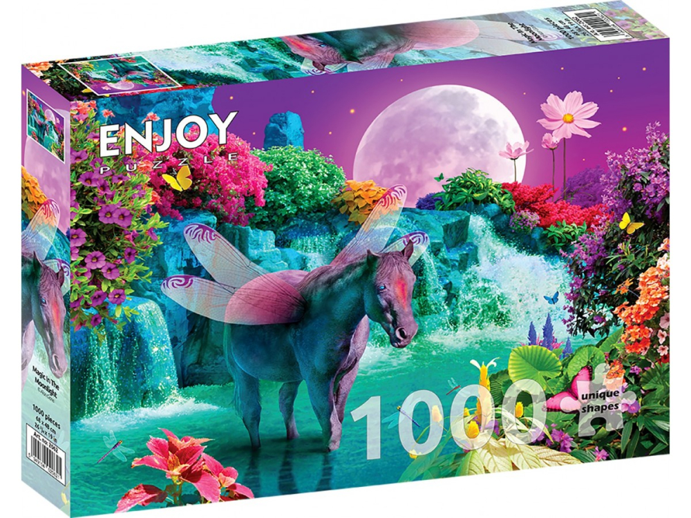 Puzzle 1000 piese Enjoy – Magic in the Moonlight te poarta intr-o lume de basm, unde magia si fantezia prind viata sub lumina lunii. Ilustratia digitala surprinde un unicorn mov, cu aripi translucide albastre, aflat in centrul unei scene fantastice dominate de o cascada impunatoare si o luna plina uriasa, in nuante roz delicat.
