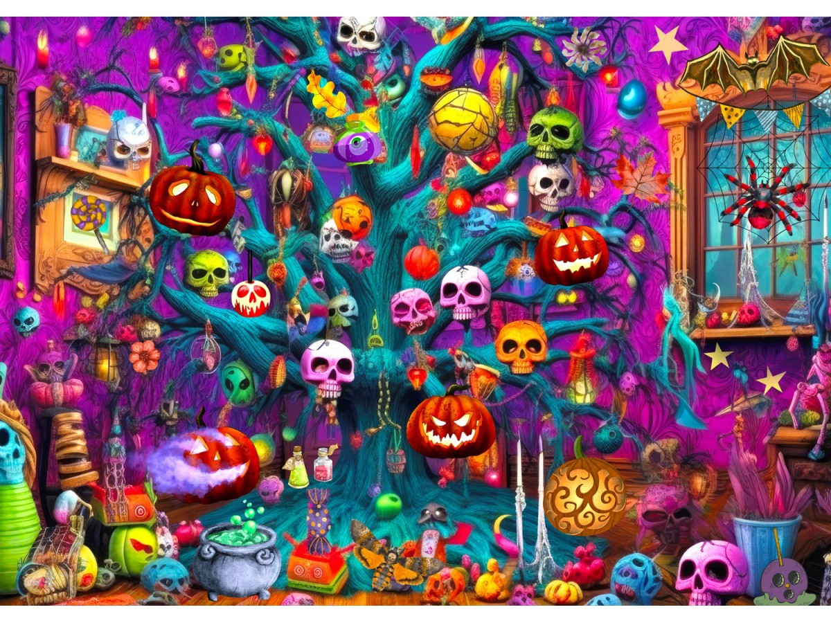 Puzzle-ul Nightmare Manor de la Enjoy prezinta o scena complexa, bogat decorata, cu tematica de Halloween si elemente supranaturale, construita in jurul unui copac central incarcat cu decoratiuni macabre. Imaginea este densa si plina de obiecte recognoscibile, precum dovleci sculptati, cranii colorate, sticle cu potiuni, lumanari, panze de paianjen si simboluri fantastice, toate integrate intr-un spatiu interior cu aspect de camera decorata festiv.