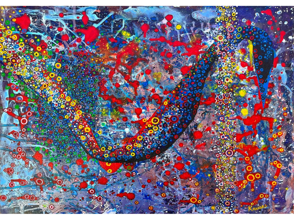Fundalul neutru, în tonuri calde de bej și gri deschis, pune în valoare intensitatea culorilor păsării, creând un contrast vizual spectaculos. Lucrarea îmbină elemente de artă abstractă și naturalism, evocând o armonie perfectă între lumea reală și cea a imaginației.