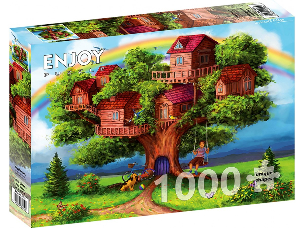 Puzzle 1000 piese Enjoy – Treehouses surprinde magia naturii intr-o scena plina de culoare, cu casute in copaci si un curcubeu senin 🌳🌈🐕