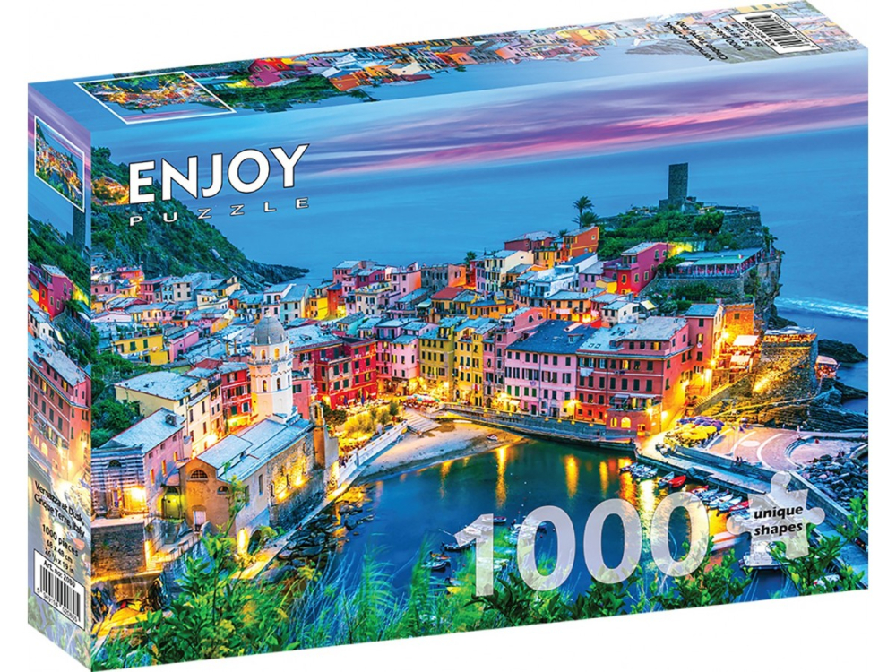 Puzzle 1000 piese Enjoy – Vernazza at Dusk, Cinque Terre, Italy reda satul Vernazza la apus, cu case colorate si mare linistita 🌅🏘️🧩