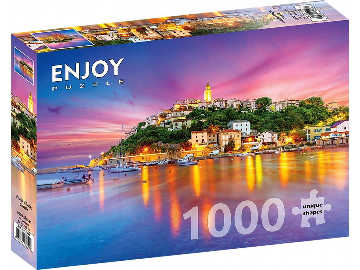 Puzzle-ul Enjoy 1000 piese – Vrbnik Village, Croatia surprinde frumusețea pitorească a satului Vrbnik, situat pe coasta Croației, cu străzi înguste și case tradiționale alb-albastre așezate pe dealuri stâncoase care coboară spre mare. Panoramele spectaculoase includ acoperișuri de țiglă roșie, vegetație mediteraneană și ape limpezi, evidențiind contrastul dintre albastrul intens al mării și culorile pastelate ale clădirilor. Fotografia panoramică redă autenticitatea și farmecul acestui sat de coastă, oferind o experiență vizuală captivantă pentru pasionații de puzzle-uri.