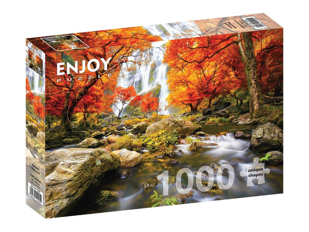 Puzzle 1000 piese Enjoy – Autumn Waterfall. O cascada tomnatica spectaculoasa, plina de culoare si energie, perfecta pentru relaxare si evadare in natura 🍂💧🧩