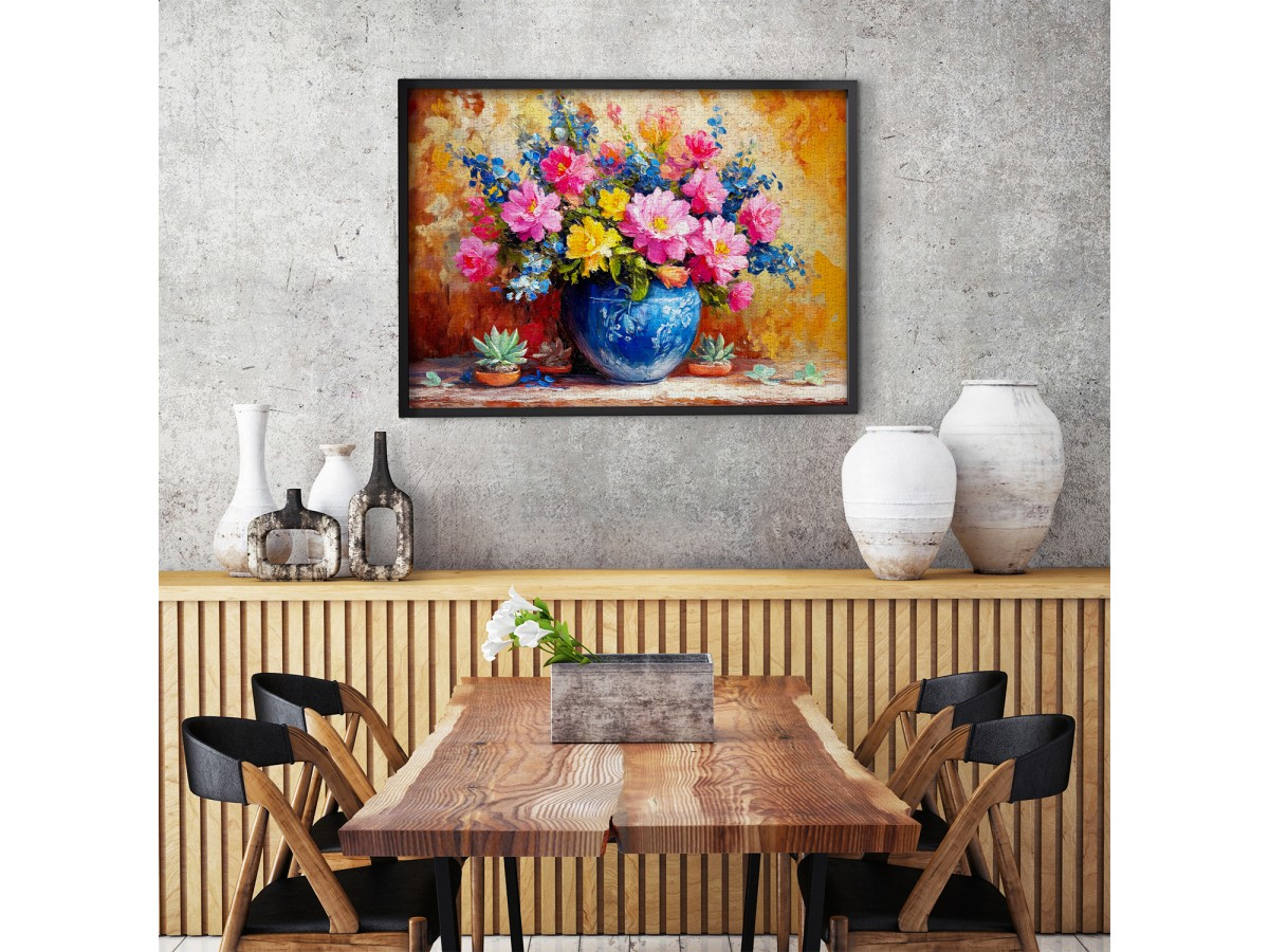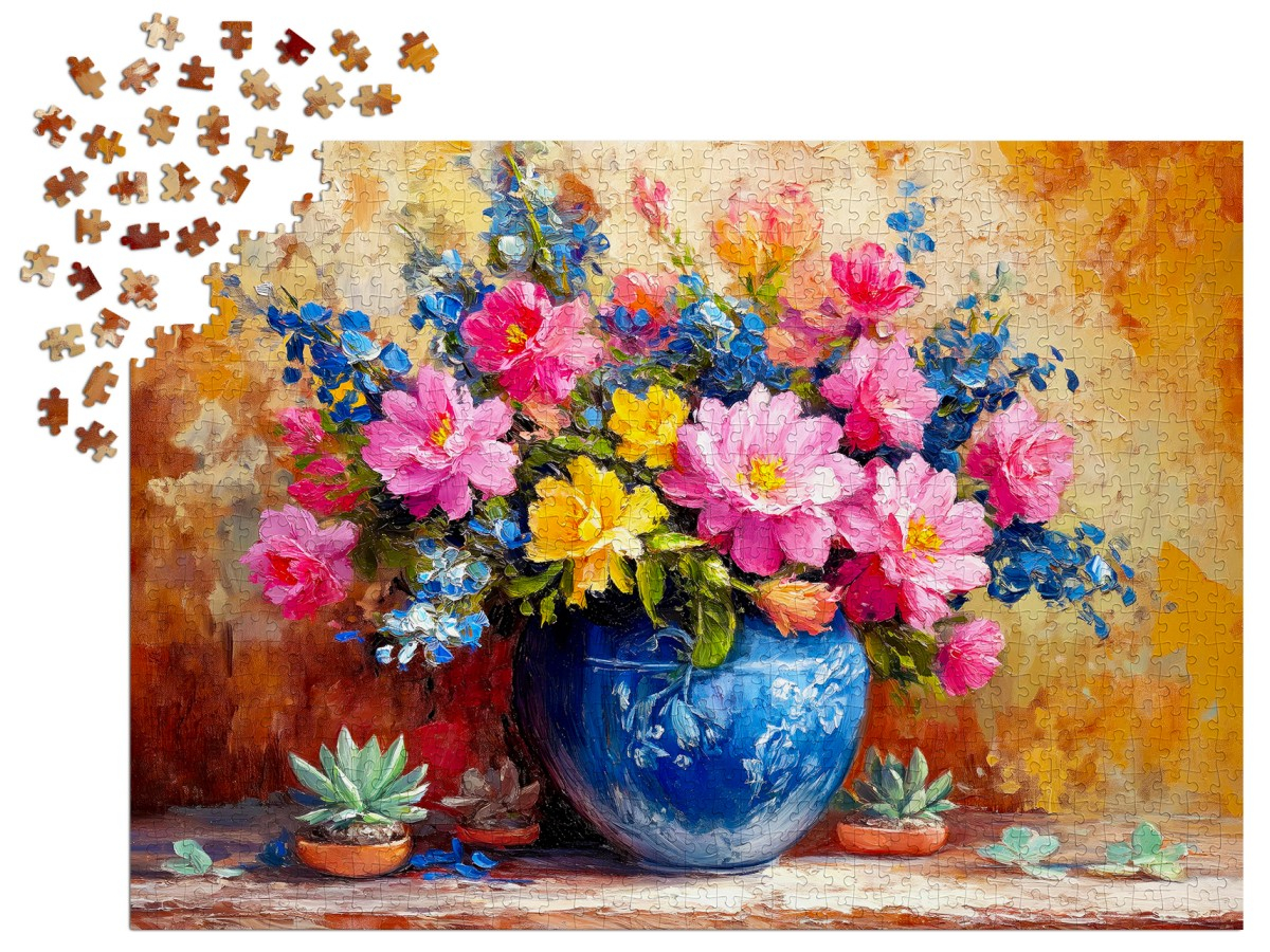 Adu eleganta si culoare in momentele tale de relaxare cu Puzzle 1000 piese Enjoy – Blushing Corner! Acest puzzle artistic infatiseaza un buchet de flori roz, galbene si albastre asezat intr-o vaza ceramica, redat in stil pictural. O explozie de culori calde si texturi fine transforma fiecare piesa intr-o mica opera de arta. Perfect pentru iubitorii de flori, arta si frumos, acest puzzle aduce un strop de primavara in orice zi.