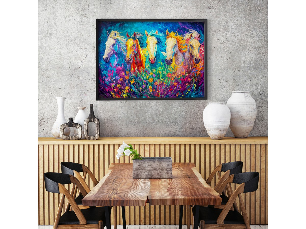 Simte energia si libertatea cu Puzzle 1000 piese Enjoy – Bright Galloping! Aceasta imagine spectaculoasa surprinde o herghelie de cai galopand printre culori vibrante, intr-o compozitie artistica plina de miscare si emotie. Ideal pentru pasionatii de puzzle-uri si iubitorii de natura, acest model combina dinamismul, culoarea si relaxarea intr-o experienta vizuala de neuitat.