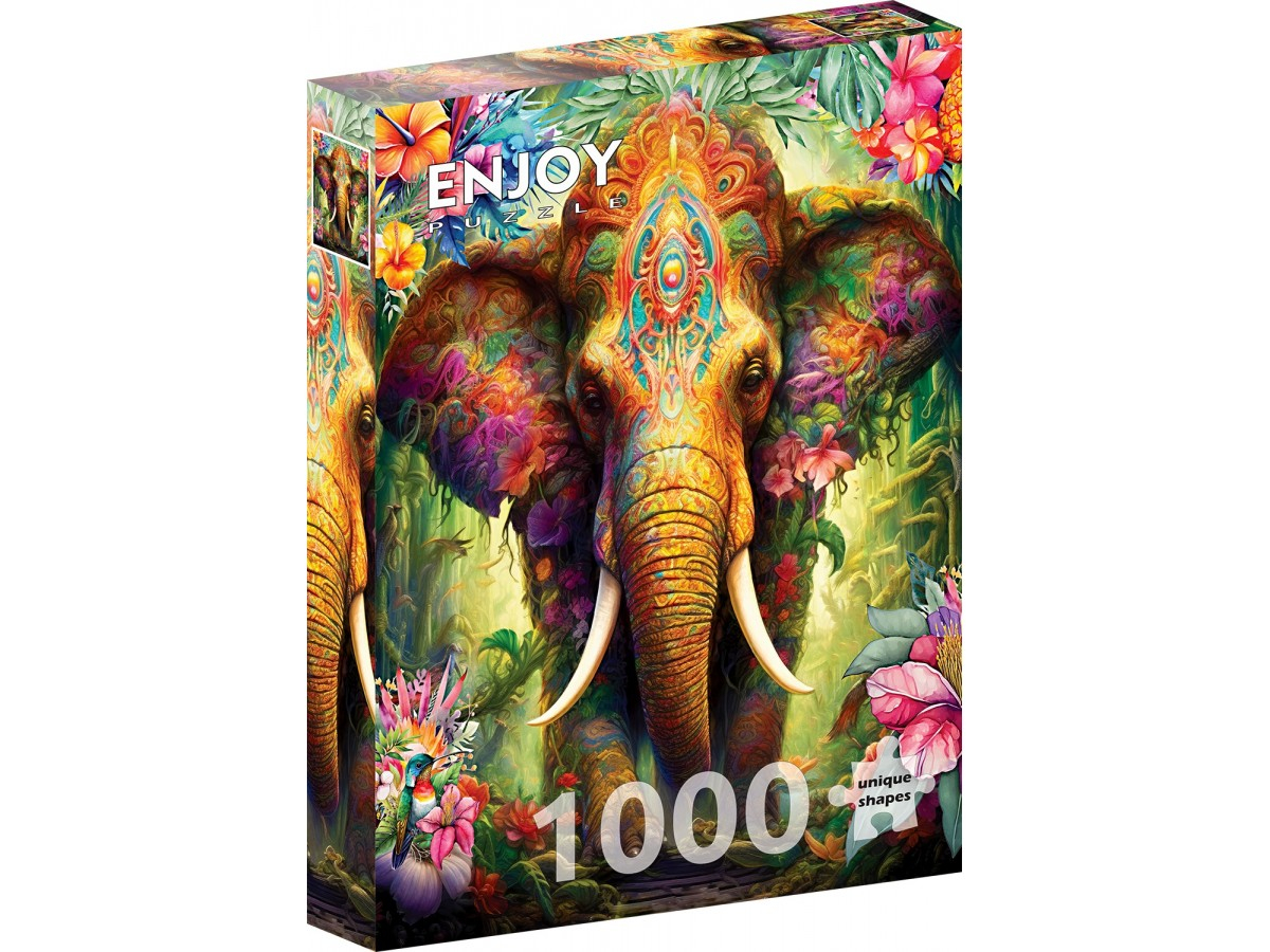 Descopera un univers exotic si armonios cu Puzzle Enjoy Celestial Botanica, o ilustratie digitala impresionanta ce infatiseaza un elefant asiatic magnific, decorat cu motive vibrante inspirate din arta traditionala indiana. Inconjurat de o vegetatie luxurianta si flori tropicale colorate, personajul central creeaza o atmosfera de jungla solara, plina de energie si echilibru vizual. Contrastul dintre forta elefantului si delicatetea botanica transforma asamblarea intr-o experienta artistica si relaxanta.