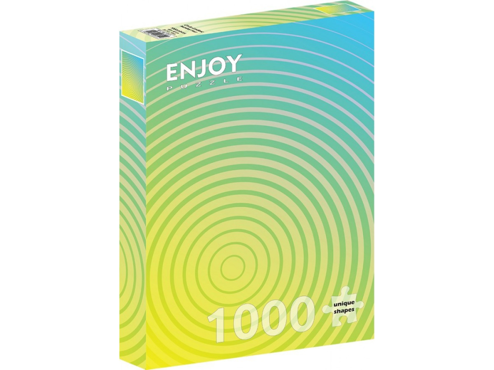 Puzzle-ul Circle Gradient Number Four – 1000 piese de la Enjoy continua seria de designuri abstracte dedicate culorii si geometriei, propunand o compozitie armonioasa construita exclusiv din cercuri concentrice si tranzitii cromatice fluide. Ilustratia digitala se bazeaza pe un gradient vibrant care evolueaza natural de la verde proaspat, trece prin tonuri calde de galben si ajunge la nuante calmante de albastru, oferind un echilibru vizual placut si modern.