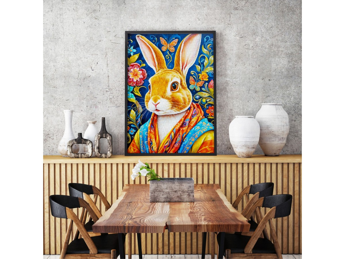 Intra intr-o lume plina de culoare si eleganta cu puzzle-ul Enjoy – Cool Rabbit, o ilustratie vibranta care imbina rafinamentul artistic cu un strop de umor. Imaginea surprinde un iepure expresiv, cu blana in nuante naturale de maro, imbracat intr-o esarfa colorata in tonuri de albastru si portocaliu. Fundalul plin de flori si fluturi stilizati completeaza perfect compozitia, oferind o atmosfera vesela si sofisticata.
