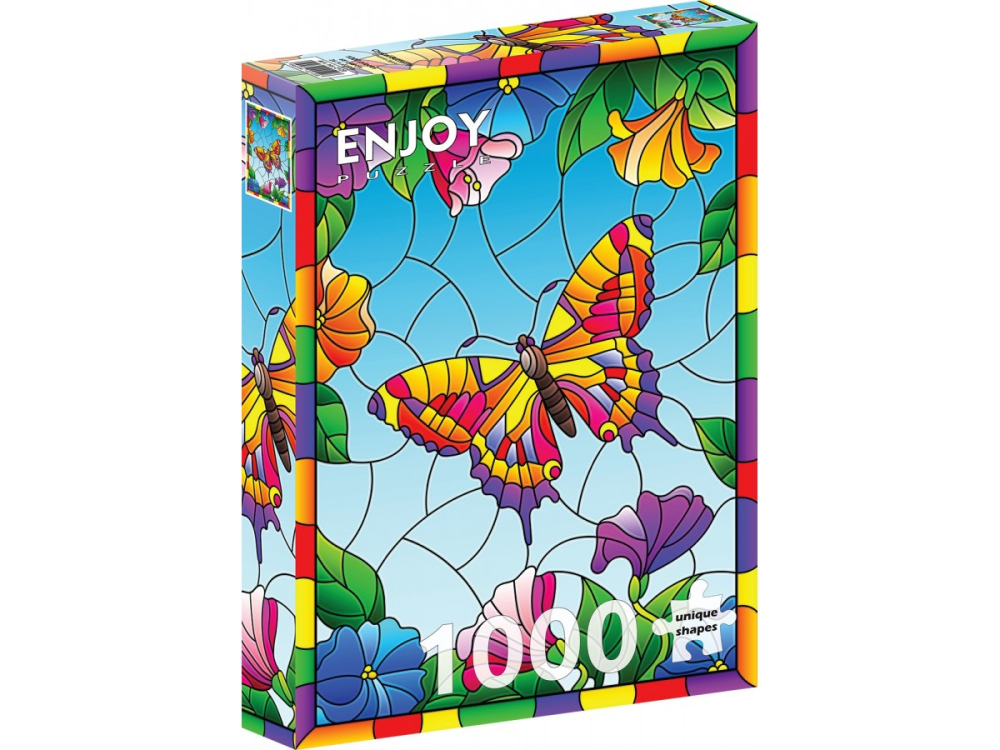 Lasă-te fascinat de lumina și culoarea din Puzzle 1000 piese Enjoy – Crystal Butterfly 🦋🌸. Un tablou digital vibrant în stil vitraliu!