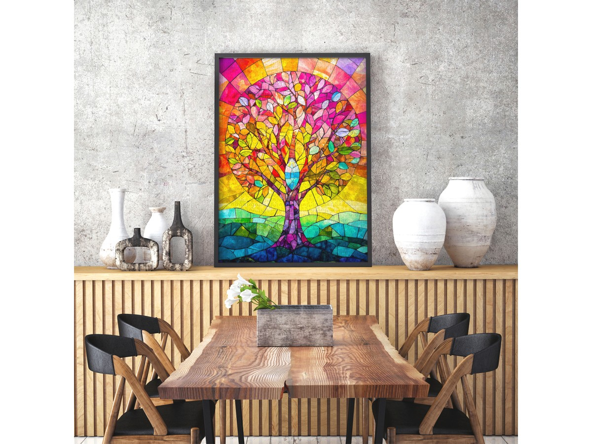 Descopera armonia culorilor si frumusetea naturii reinterpretata artistic cu puzzle-ul Enjoy – Crystallized Tree, o ilustratie digitala spectaculoasa ce infatiseaza un copac stilizat, plin de vitalitate, construit din forme geometrice ce amintesc de sticla colorata. Trunchiul solid se ridica elegant dintr-un peisaj abstract, iar coroana copacului explodeaza intr-un curcubeu de nuante – rosu, galben, verde, albastru si violet – creand un efect vizual de vitraliu modern. Aceasta imagine vibranta transmite echilibru, energie si optimism, fiind perfecta pentru cei care apreciaza arta contemporana si momentele de relaxare creativa.