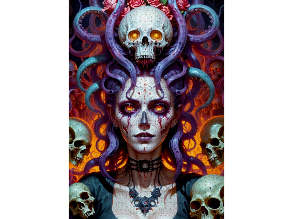 Intra intr-o lume plina de mister si simbolism cu Puzzle 1000 piese Enjoy – Dark Witch, o ilustratie digitala gotica ce surprinde portretul fascinant al unei vrajitoare enigmatice. Personajul central, cu pielea palida si ochii rosii stralucitori, poarta o coroana spectaculoasa formata din tentacule mov si cranii umane, emanand o aura de putere si misticism. Simbolurile oculte si flacarile stilizate din fundal intensifica atmosfera intunecata si hipnotizanta a compozitiei.