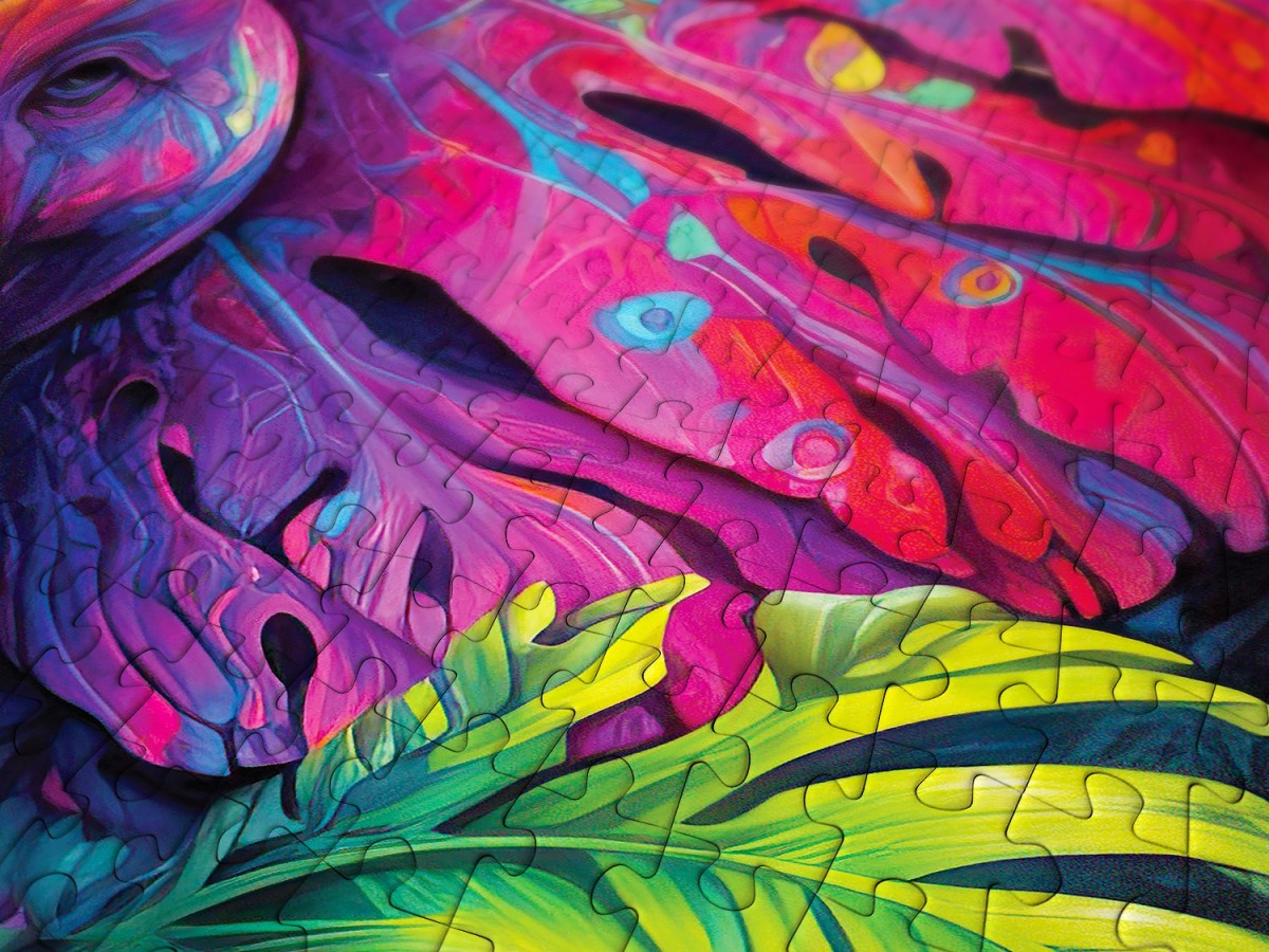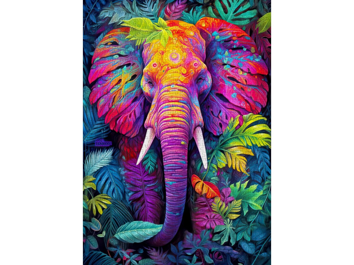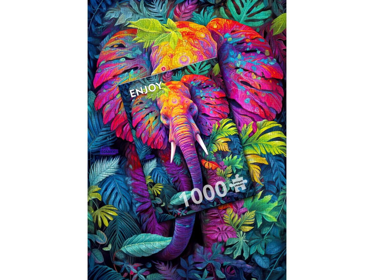 Descopera lumea exotica si plina de culoare a puzzle-ului Enjoy – Disguised Elephant, o ilustratie digitala spectaculoasa ce surprinde un elefant colorat in nuante vibrante de mov, rosu si albastru, inconjurat de vegetatie tropicala luxurianta. Imaginea, realizata cu detalii complexe si o paleta cromatica bogata, imbina armonios naturalul cu abstractul, oferind o experienta vizuala hipnotizanta. Perfect pentru adultii pasionati de arta moderna, natura si puzzle-uri provocatoare.