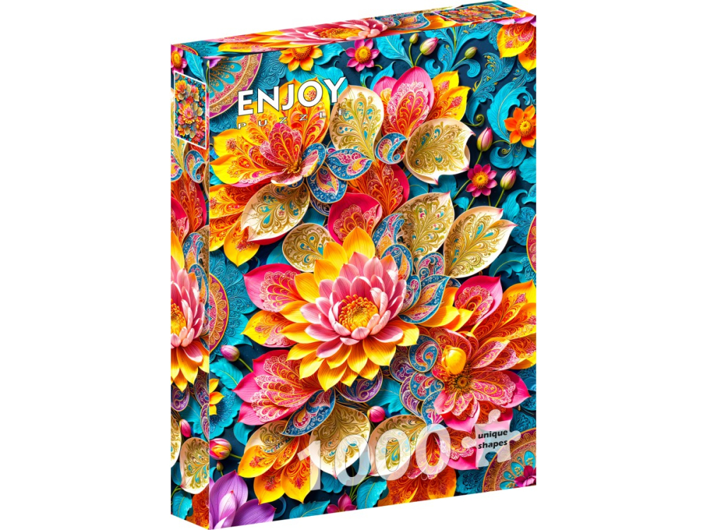 Puzzle-ul Enjoy – Elegant Waterlilies reda o compozitie florala spectaculoasa, plina de culoare si rafinament. Imaginea prezinta flori de lotus si nuferi stilizati, ilustrati in nuante intense de galben, roz, turcoaz si portocaliu, cu accente fine aurii care confera profunzime si eleganta. Fiecare petala este detaliata cu motive decorative bogate, transformand intreaga imagine intr-o adevarata explozie vizuala de frumusete si armonie.