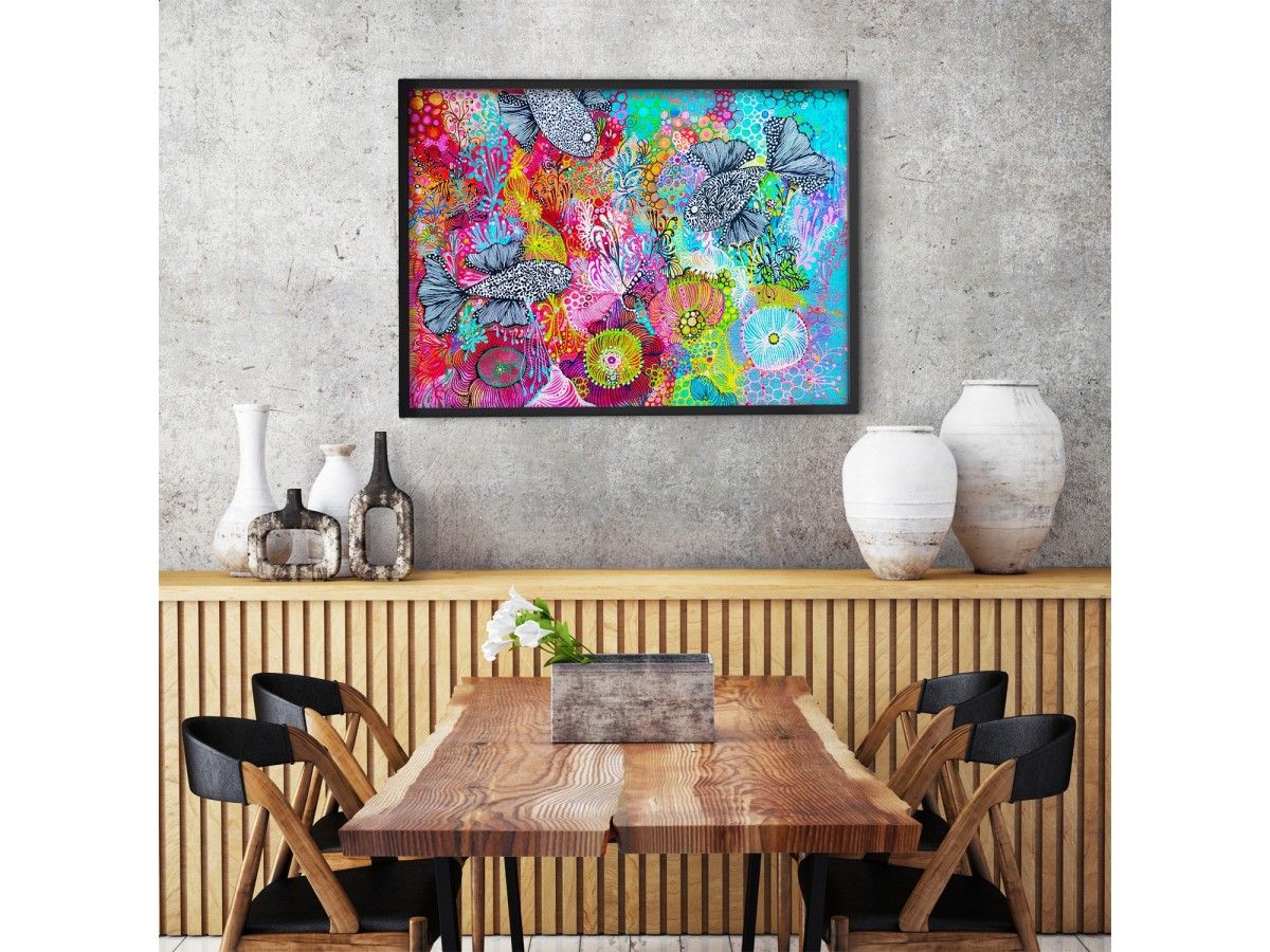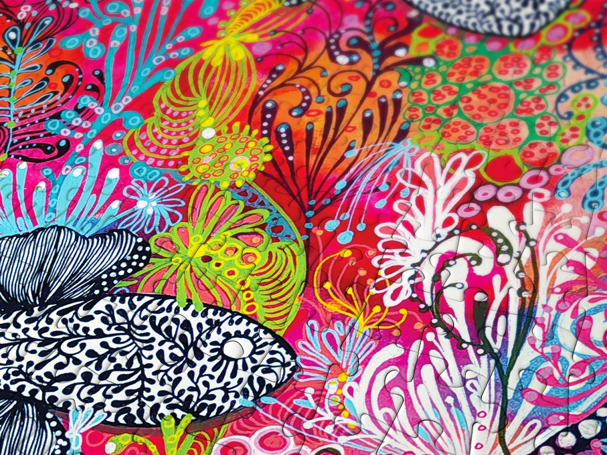 Explorează magia adâncurilor marine cu Puzzle 1000 piese Enjoy – Euphoric Depths, o ilustrație digitală spectaculoasă care te poartă într-o lume subacvatică plină de culoare și viață! Reciful vibrant prinde viață prin nuanțe de roz, albastru, verde și portocaliu, unde peștii multicolori înoată printre corali stilizați, într-un dans vizual fascinant. Un puzzle perfect pentru relaxare, concentrare și evadare într-un univers artistic plin de detalii.