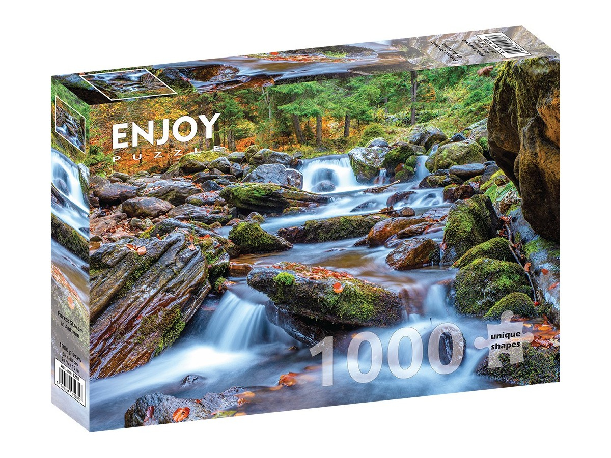 Puzzle 1000 piese Enjoy – Forest Stream in Autumn. Un peisaj de toamna cu parau de munte, frunze colorate si apa limpede, ideal pentru relaxare si evadare in natura 🍂🌲💧