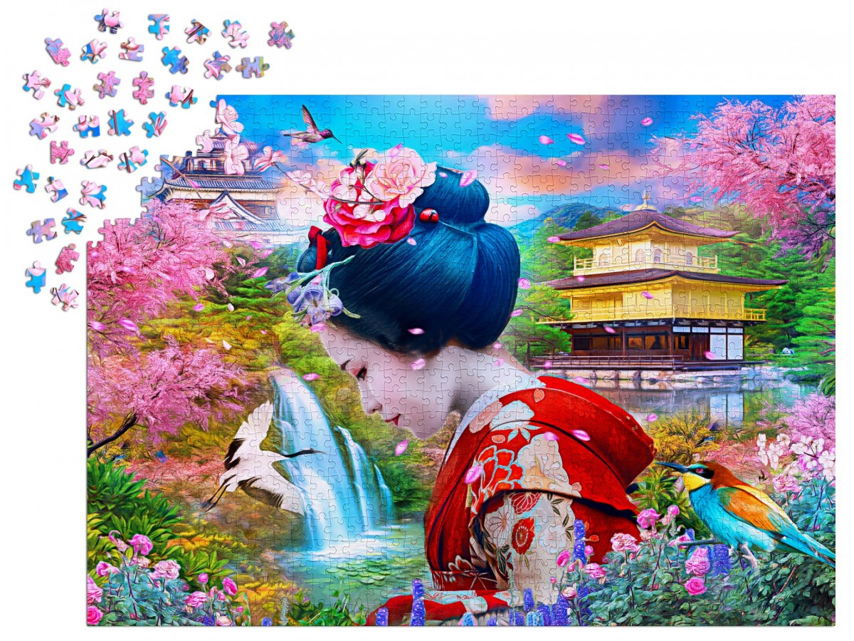 Patrunde in atmosfera eleganta a Japoniei traditionale cu puzzle-ul ENJOY – Geisha Garden, o ilustratie digitala de o frumusete aparte, care te poarta intr-o gradina inflorita de ciresi. In centrul compozitiei se afla o geisha rafinata, imbracata intr-un kimono rosu cu detalii florale fine si accesorii elaborate, inconjurata de natura luxurianta si simboluri culturale japoneze.