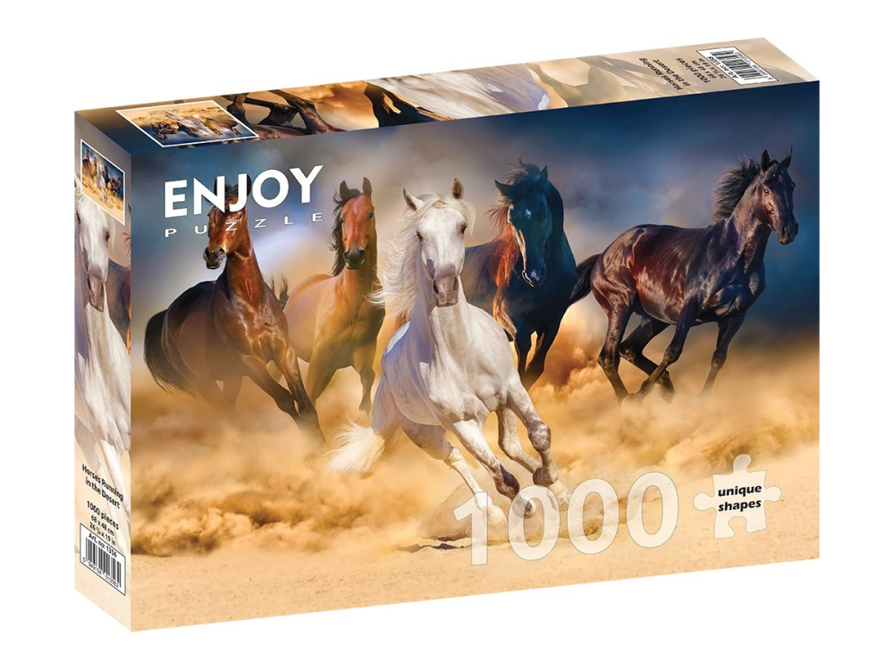 Forță, libertate și mișcare 🐎 Puzzle 1000 piese Enjoy – Horses Running in the Desert, o scenă spectaculoasă de energie și natură.